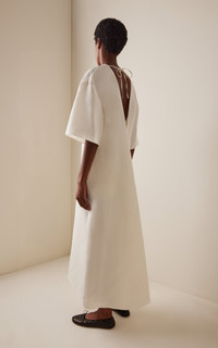 With a focus on exceptional fabrics, impeccable details and uncompromising quality, The Row explores the strength of simplistic shapes, resulting in timeless staples with subtle irreverence. Ankle-length dress in natural silk shantung with dropped shoulders, open back with tie at neckline, and A-line silhouette. PRODUCT DETAILS - Pre-Fall '25 - Slip on - Composition: 100% silk - Dry clean - Made in Italy