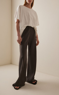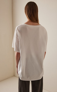 With a focus on exceptional fabrics, impeccable details and uncompromising quality, The Row explores the strength of simplistic shapes, resulting in timeless staples with subtle irreverence. The ‘Nadina’, delivered in a bespoke pastel hue, is designed with a classic crewneck, dropped shoulders and an oversized fit for a touch of masculinity. Made from breathable cotton-jersey, this comfortable top can be styled as a single layer or underneath a boxy blazer. PRODUCT DETAILS - Spring/Summer ‘25 - Slip on - Composition: 100% cotton - Machine wash - Designer color: Ply - Made in Italy SIZE & FIT - Our model is wearing a size Small - Model is 5'8.5" with a 31" bust, 23" waist, and 34" hip