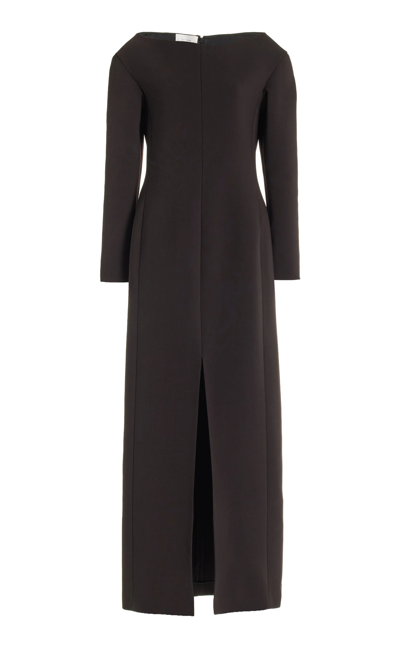 With a focus on exceptional fabrics, impeccable details and uncompromising quality, The Row explores the strength of simplistic shapes, resulting in timeless staples with subtle irreverence. Full length column dress in double-faced stretch wool with wide boat neckline, long fitted sleeves, and central front slit detail. PRODUCT DETAILS - Resort '24 - Concealed zip fastening along back - Composition: 97% virgin wool, 3% elastane; Lining: 100% silk - Designer color: Hickory - Dry clean - Made in Italy SIZE & FIT - Our model is 180cm/ 5'11" and wearing a US 2 - This item fits true to size, we suggest taking your usual size - Designed for a slim fit