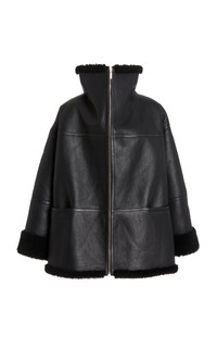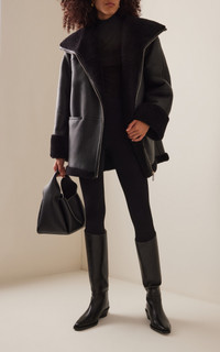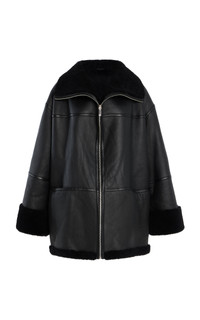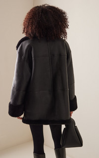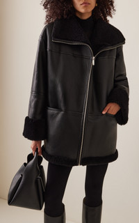You can expect luxe fabrics and innovative craftsmanship featured in every Toteme collection. The 'Menfi' coat captures the label's pared-back DNA without sacrificing sophistication. Ideal for blustering winter mornings, it's cut from black shearling in a loose, relaxed silhouette that can be easily layered atop chunky knits and turtlenecks. PRODUCT DETAILS - Zip fastening through front - Composition: 100% shearling - Dry clean - Imported SIZE & FIT - Our model is wearing a size Small - Our model is 5'11" with a 31" bust, 23" waist, and 34" hip - This style runs large, we suggest taking one size down