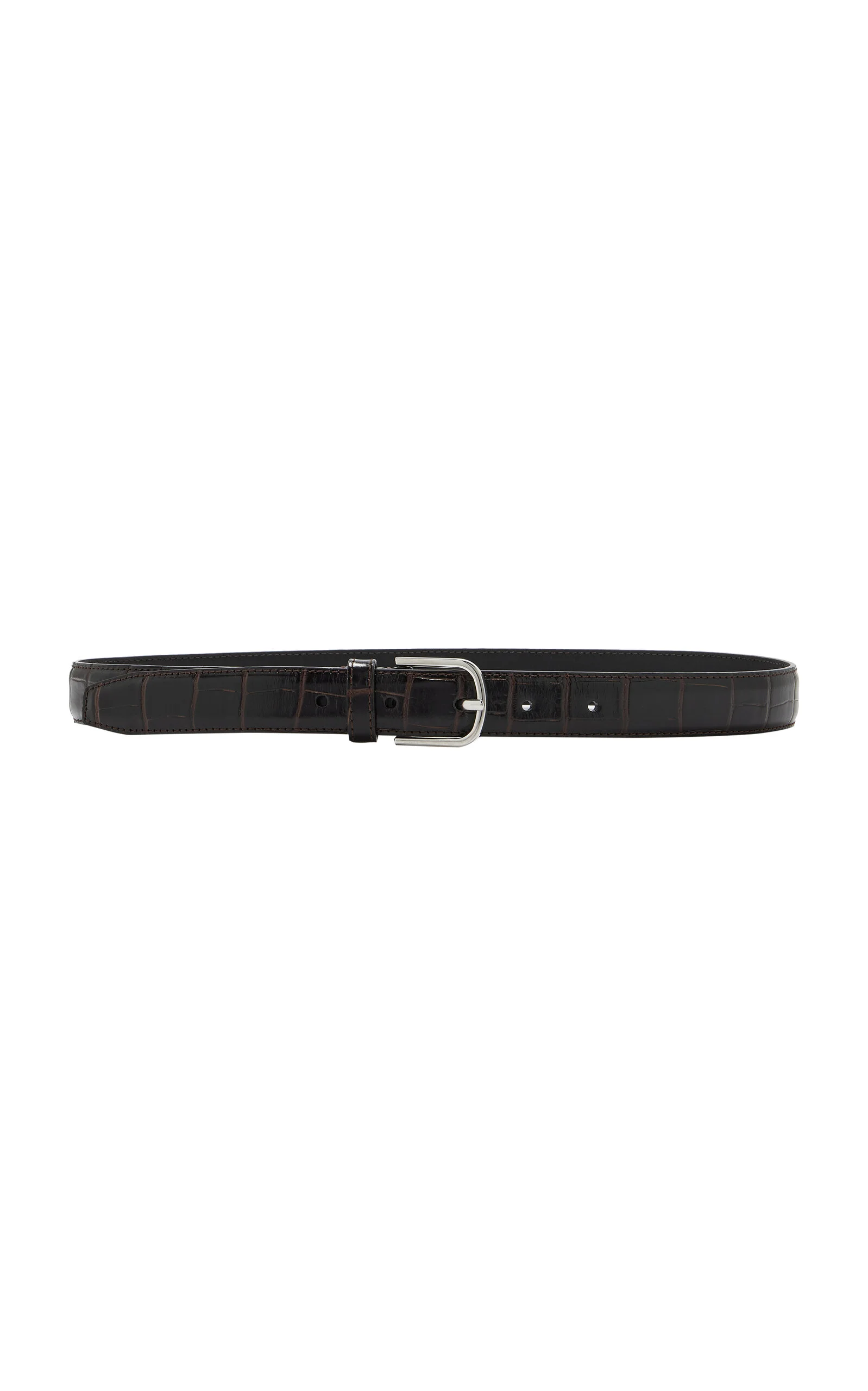 With its signature clean lines and minimalist style, Stockholm-based Toteme is the quintessential Scandi-cool. Elin Kling designs each collection as a modern uniform, looking to vintage pieces for inspiration and giving its cult following a dress code for every day. Encapsulating simplicity, the label constructs this slim belt from crocodile-effect leather paired with polished silver hardware. Its designed so sit on the waist and adjusts to suit you. PRODUCT DETAILS - Buckle fastening - Composition: 100% calf leather - Designer color: Chocolate - Made in Italy