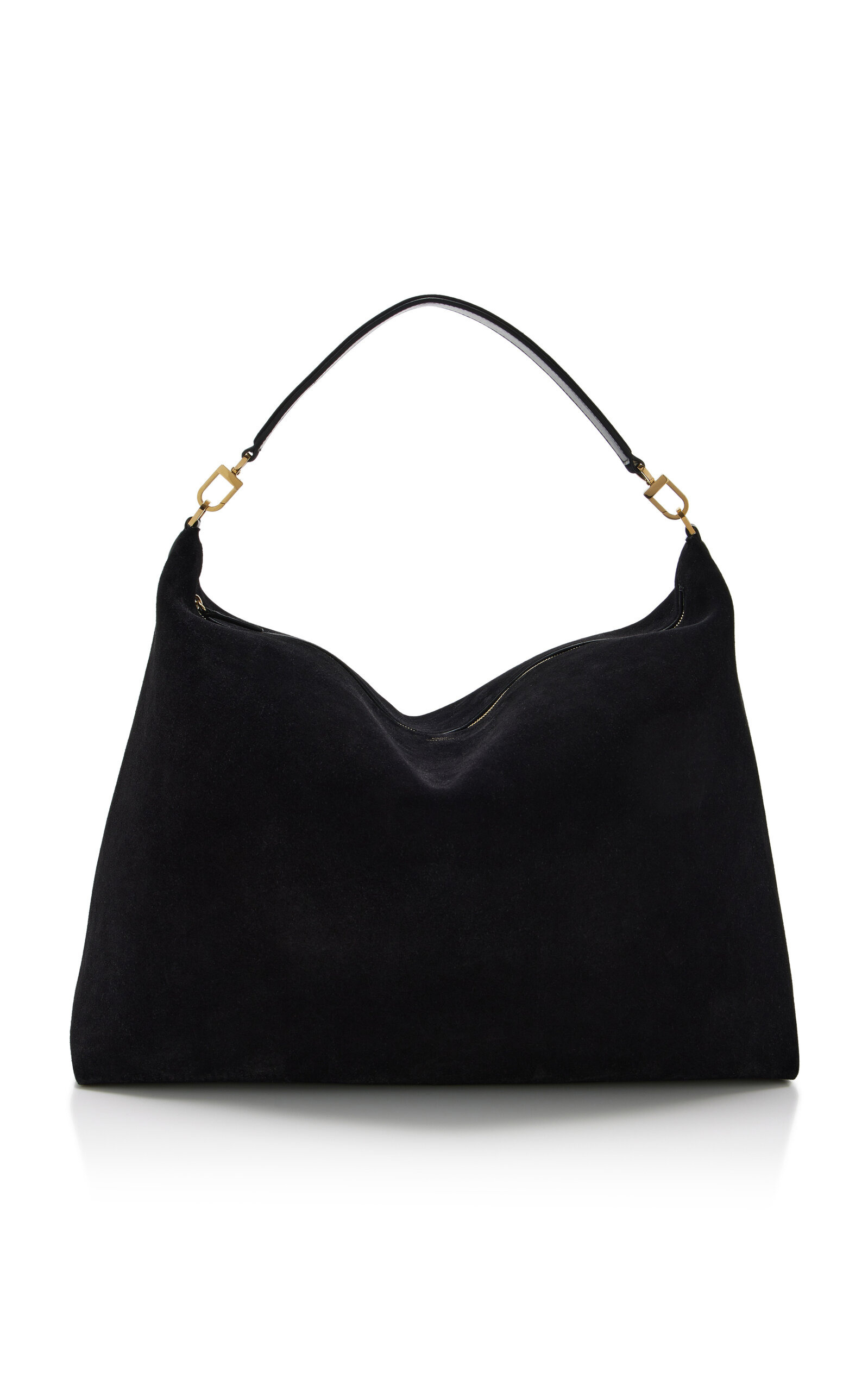 With its signature clean lines and minimalist style, Stockholm-based Toteme is the quintessential Scandi-cool. Elin Kling designs each collection as a modern uniform, looking to vintage pieces for inspiration and giving its cult following a dress code for every day. The 'Scoop' tote is cut from buttery black suede with a sculptural, slouchy shape that lives up to its name. Designed for ease and versatility, it features a curved top and smooth leather handle with gold-tone hardware. PRODUCT DETAILS - Zip fastening - Composition: suede - Made in Italy