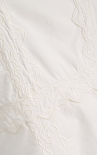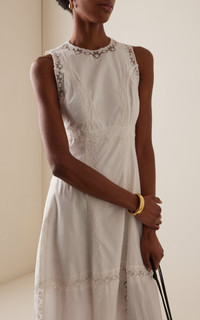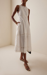 “The collection speaks in intimate dialogue with the wearer, awash in a diffuse radiance as if alight from within,” Ulla Johnson The 'Anela' sleeveless midi dress has a classic A-line silhouette cut from breezy cotton that flares out from just under the bust. The sheer embroidery detail lends an ethereal feel perfect for high summer days. PRODUCT DETAILS - Pre-Fall '25 - Zip fastening - Composition: 100% cotton; Combo: 100% nylon; Embroidery: 100% polyester - Designer color: Pristine - Dry clean - Imported SIZE & FIT - Our model is wearing a size US 2 - Model is 5'10" with a 31" bust, 23.5" waist, and 33.5" hip - Designed for a slim fit