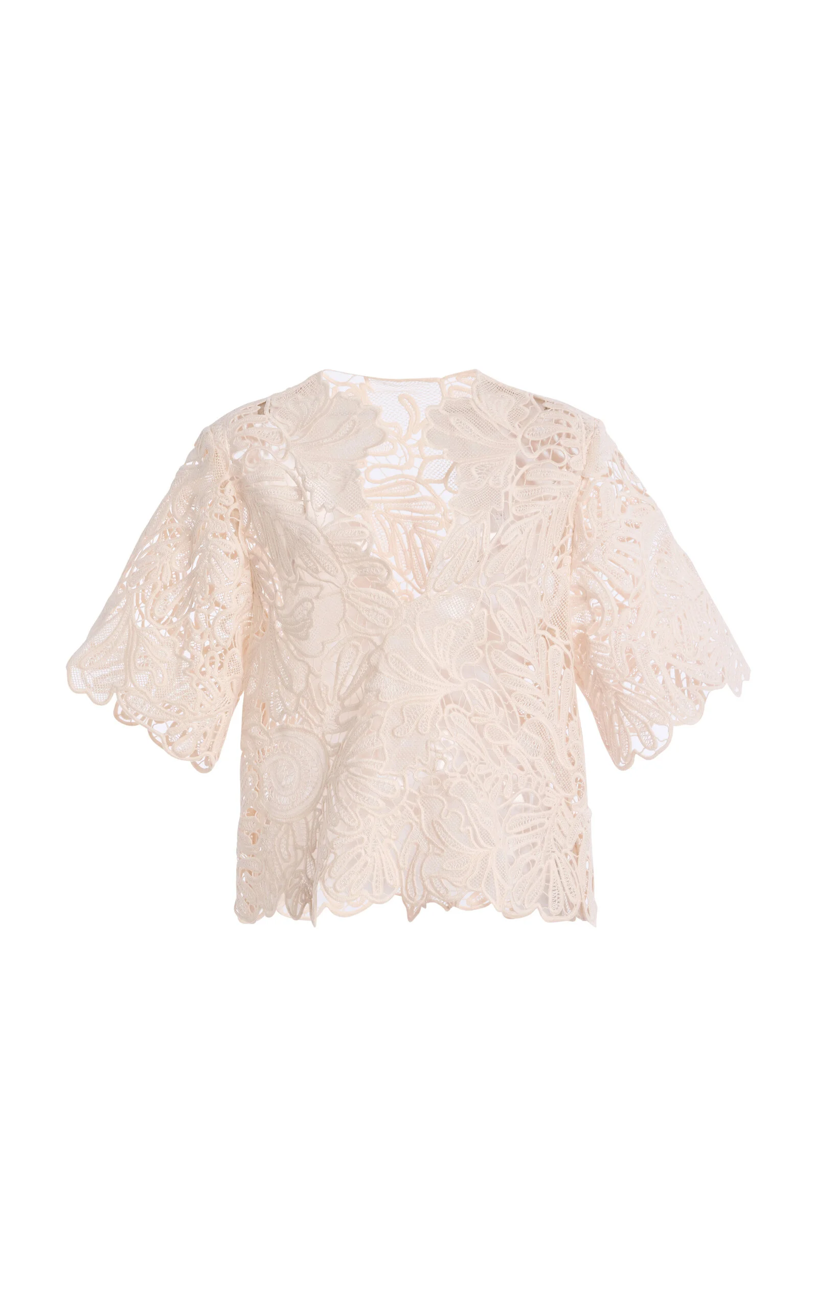 The latest in a series of artist collaborations, the Spring / Summer '26 collection taps the estate of abstract expressionist Helen Frankenthaler, whose influence is felt in genius color clashes (antique rose and acid green, blush and electric blue) and straight-from-the-canvas motifs. Delicately cut with scalloped edges, the Dua Lace Silk Top is crafted in intricate lace with a soft, boxy silhouette that lends a romantic finish to both tailored and fluid looks. PRODUCT DETAILS - Spring Summer '26 - Slip on - Composition: 100% polyester; 100% silk - Designer color: Chalk - Dry clean - Imported
