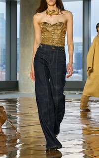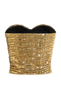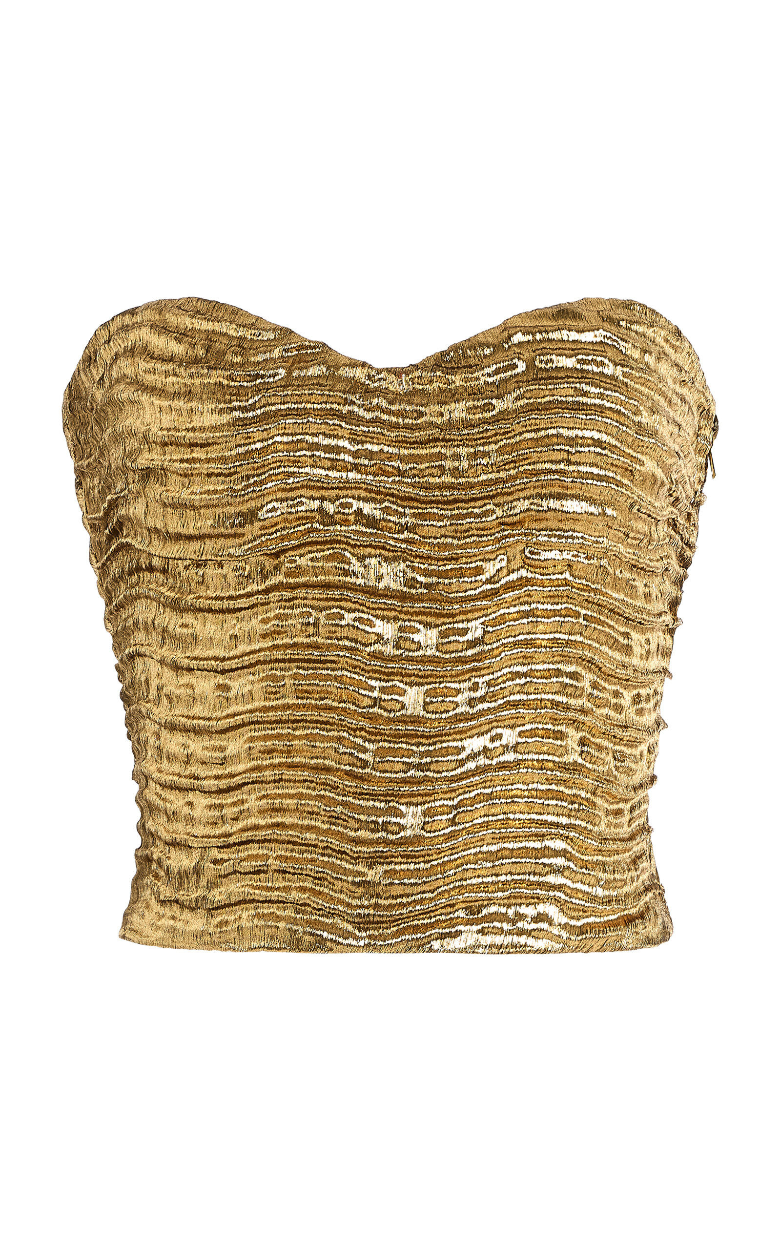 PRODUCT DETAILS - Slim fit, strapless with sweetheart neckline, gathered detailing throughout, cropped silhouette - Zipper Closure Through Back - Lined - Composition: 46% Metallic, 20% Polyamide, 16% Polyester, 8% Acrylic, 7% Silk, 3% Nylon - Color: gold - Dry Clean Only - Fall-Winter '25