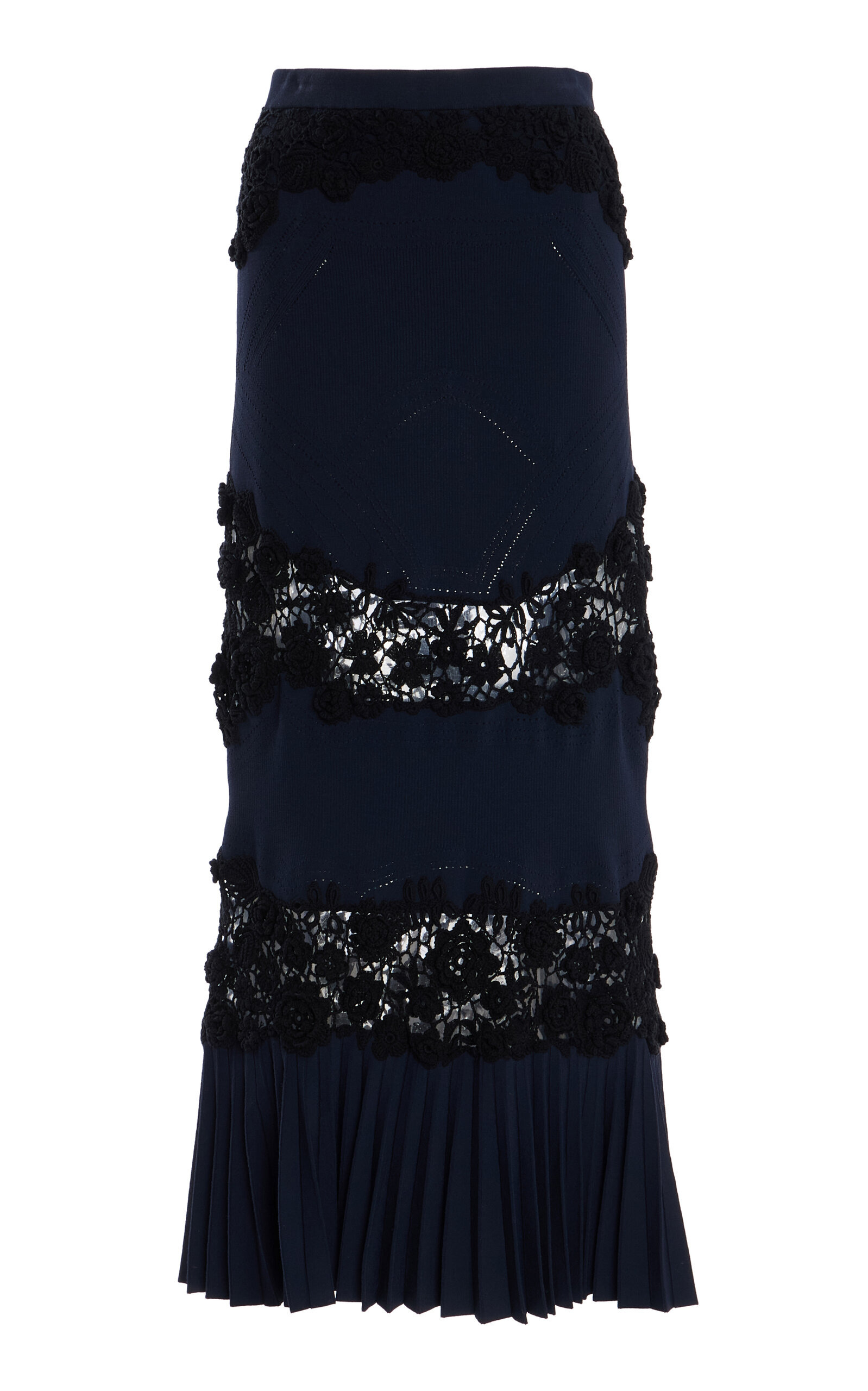 PRODUCT DETAILS - Regular fit, high rise, floral embroidered, ruffled hemline, A-line silhouette maxi skirt - Slip-On - Partially Lined - Composition: Body: 83% Viscose, 17% Elastane - Crochet: 100% Cotton - Color: blue - Dry Clean Only - Pre-Fall '25