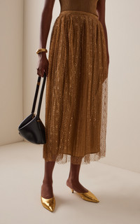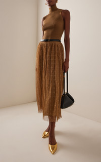 PRODUCT DETAILS - Loose fit, high rise, metallic lace, pleated detailing with A-line silhouette - Side zip - Lined - Composition: 58% Polyamide, 42% Metallic Fibers - Dry Clean Only - Pre-Fall '25