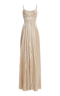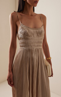“The collection speaks in intimate dialogue with the wearer, awash in a diffuse radiance as if alight from within,” Ulla Johnson The Reine Gown is made from black satin with a smooth, silken texture and subtle sheen. Beautifully pleated throughout, this event-ready dress is suspended from slender straps with elegant binding at the bodice and billowing, fluid volume at the floor-sweeping skirt. PRODUCT DETAILS - Pre-Fall '25 - Zip fastening - Composition: 55% recycled polyester, 45% polyester - Designer color: Opal - Dry clean only - Imported