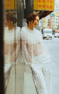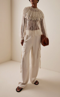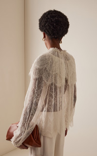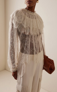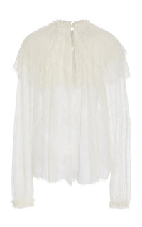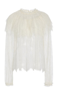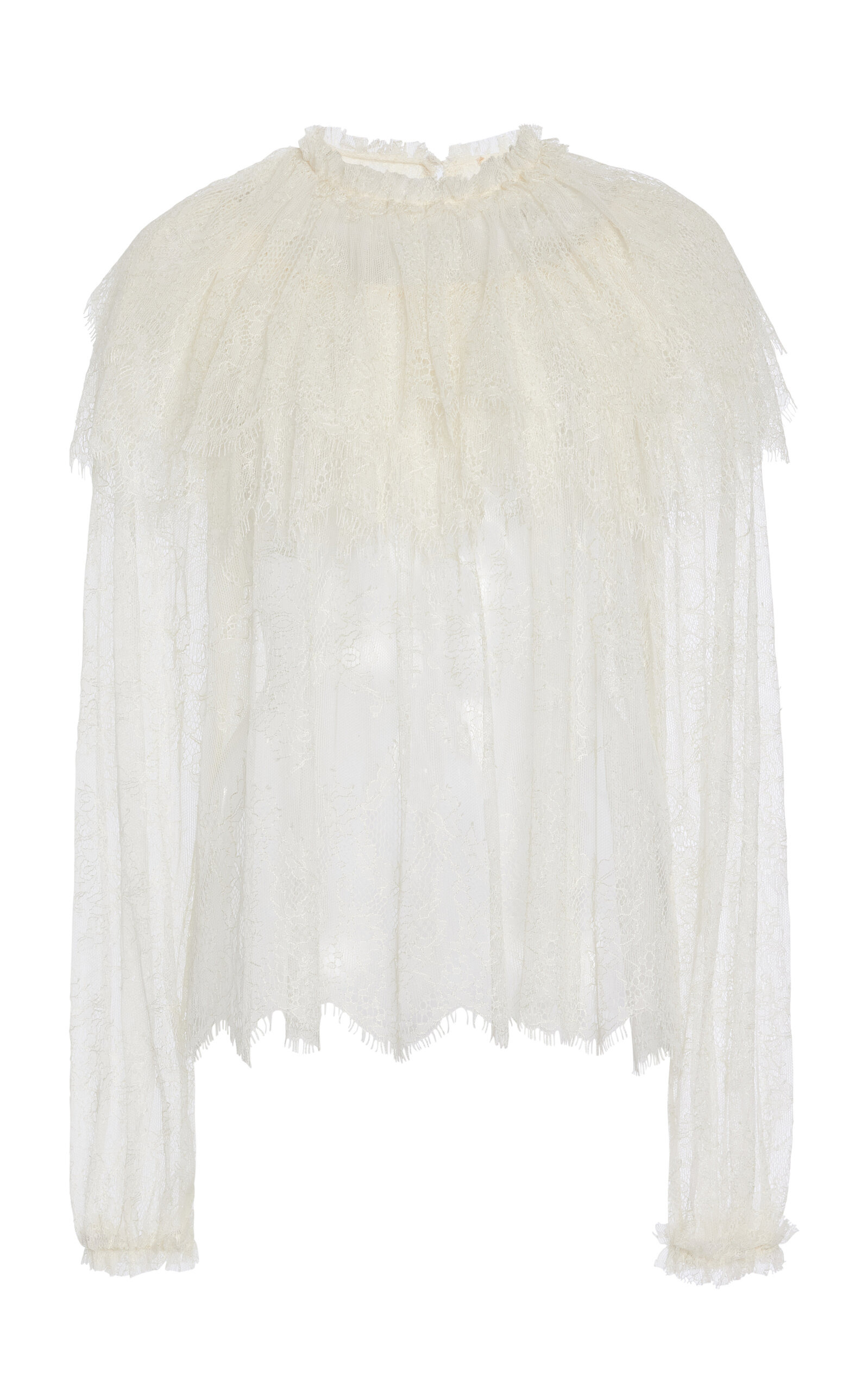 PRODUCT DETAILS - Loose fit, high neckline with capelet detail, peasant sleeves - Front Button Fastening - Unlined - Composition: 75% Polyamide, 25% Viscose - Color: ivory - Dry Clean Only - Pre-Fall '25