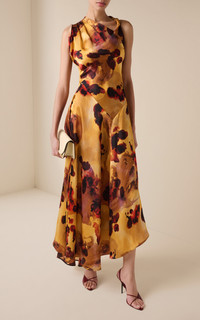 PRODUCT DETAILS - Twisted strap, asymmetric neck, paneled draped, midi hem - Concealed zip fastening - Unlined - Composition: 100% Silk - Color: Amber - Dry clean only - Pre-Fall '25