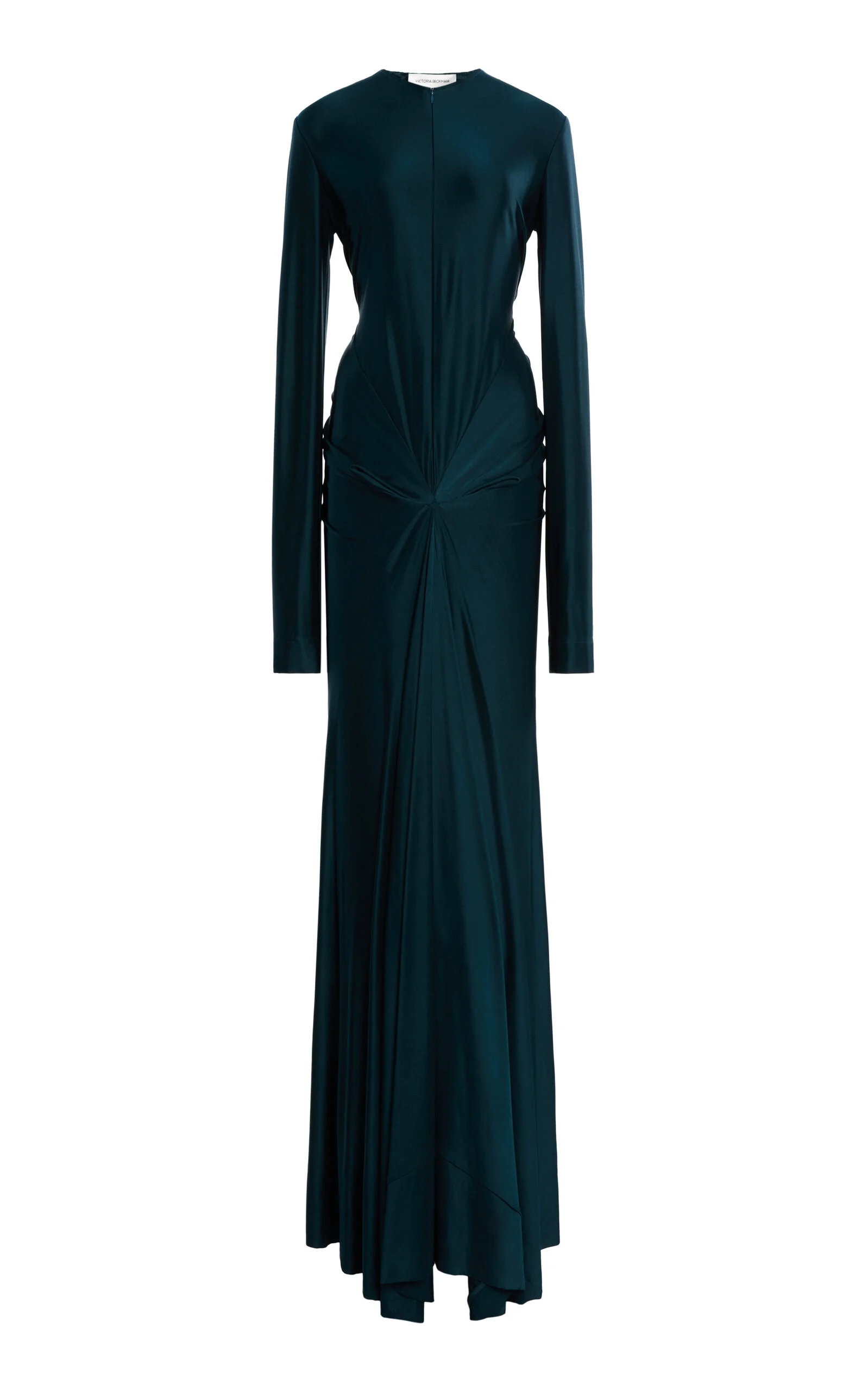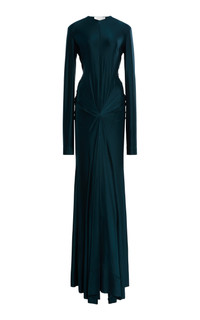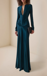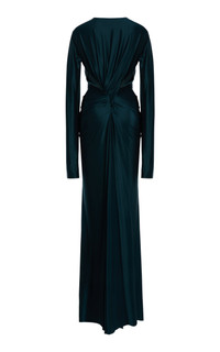 The Londoner continues to build on her empowering uniform with wearability, femininity, and sophisticated polish in equal measure. Find trademark ‘70s-edged tailoring, prints, and new finishes alongside streamlined designs with seductive touches. This fitted gown is cut from a weighted jersey, which highlights and contours the frame. Beneath the plunging neckline are elaborate twists and cut-outs which further accentuate the waist and hips. Add a tonal clutch and heels for the occasion. PRODUCT DETAILS - Resort ‘26 - Slip on - Composition: 90% viscose, 10% elastane - Dry clean - Designer Color: Dark Teal - Imported