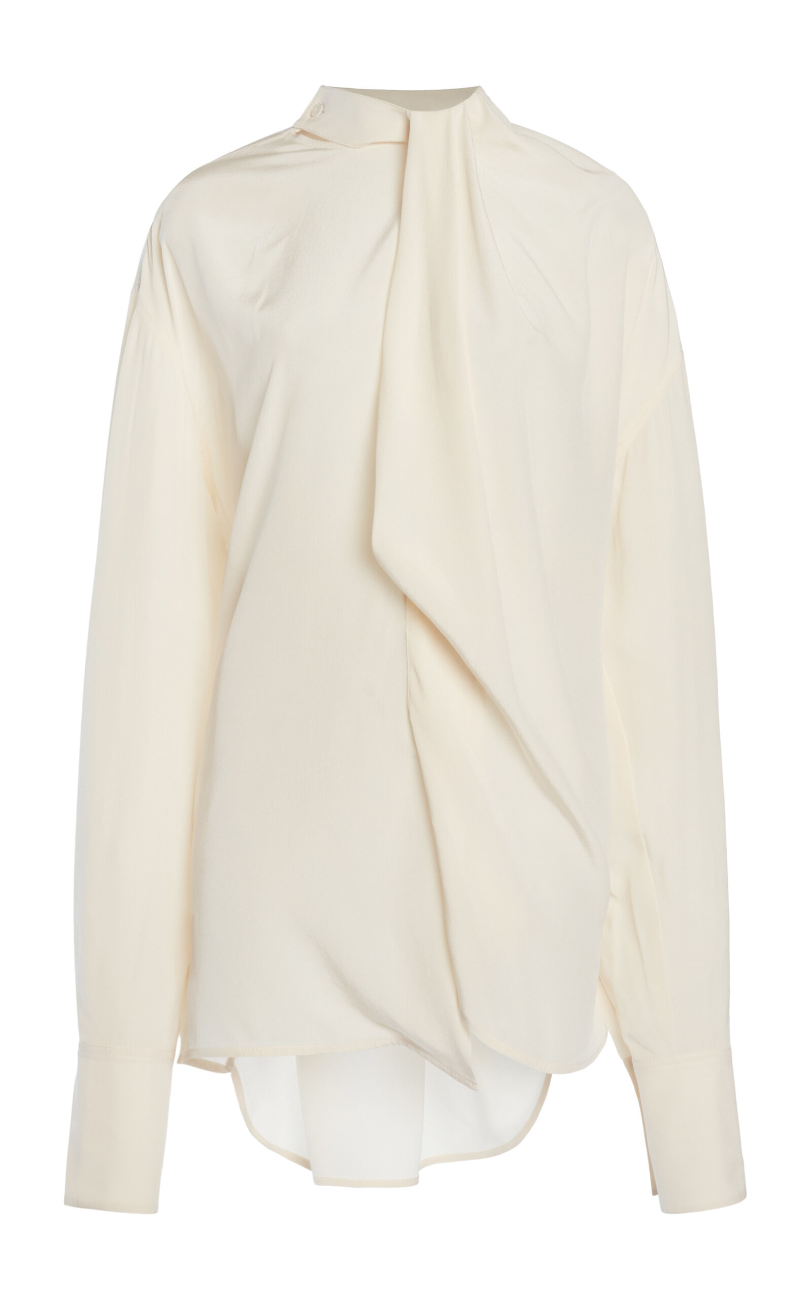 PRODUCT DETAILS - Long sleeve, slash detail with drape, loose fit, asymmetric hem - Slip on - Unlined - Composition: 100% Silk - Color: Ivory - Dry clean only - Pre-Fall '25
