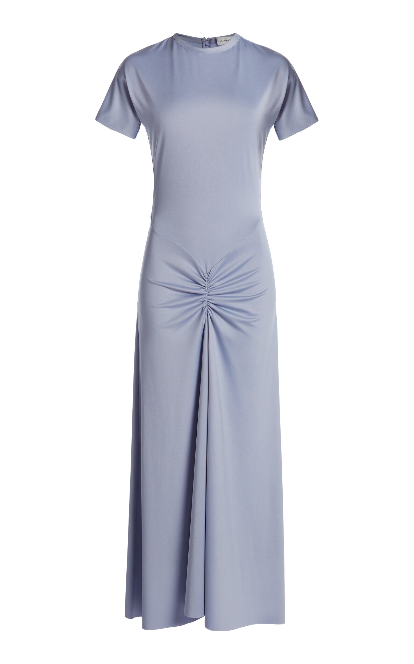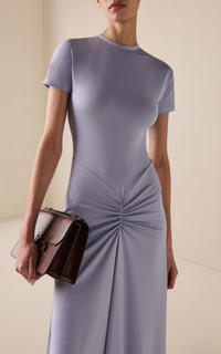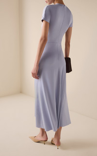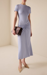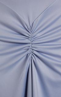 PRODUCT DETAILS - Short sleeve, crew neck, gathered front seam, midi hem - Concealed zip fastening - Unlined - Composition: 90% Polyester 10% Elastane - Color: Delphinium - Dry clean only - Pre-Fall '25