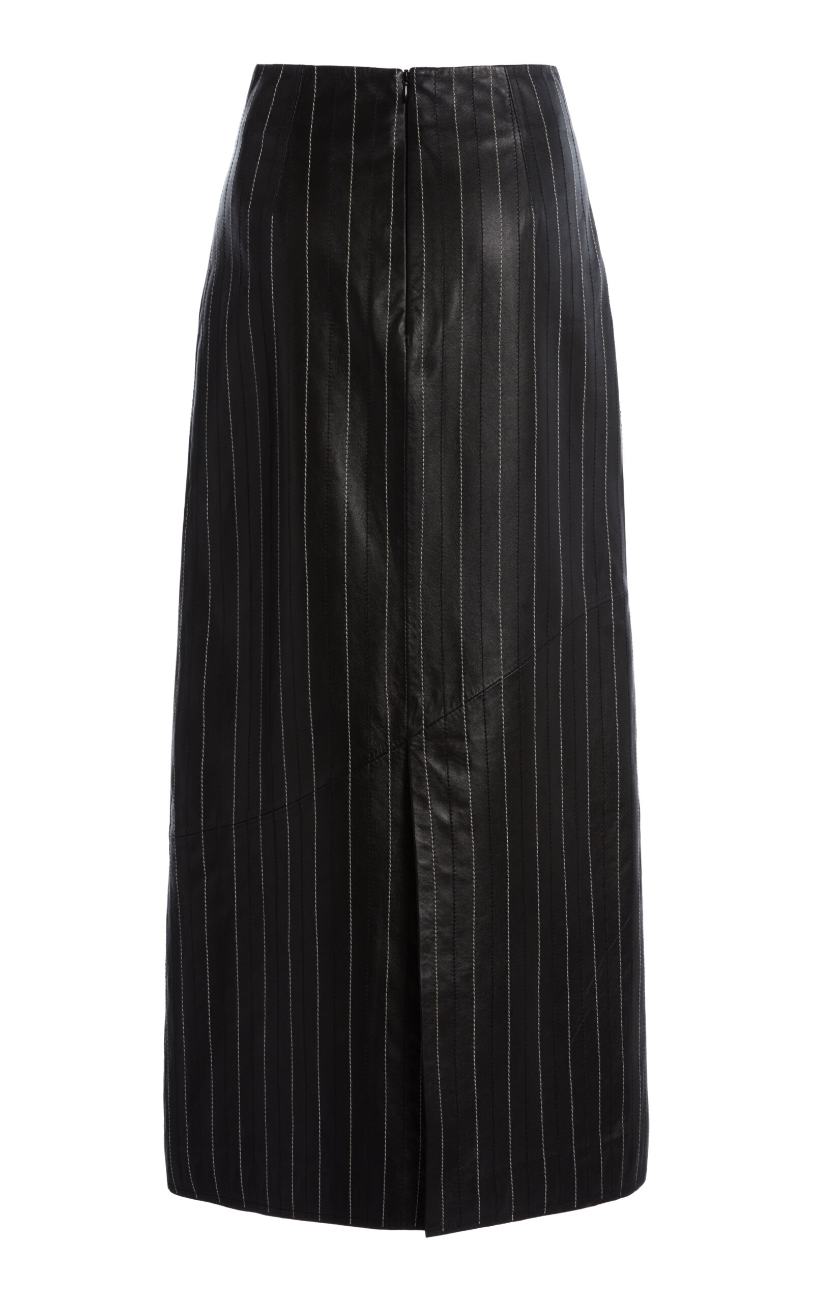 Paneled embroidered pinstriped leather midi skirt Black