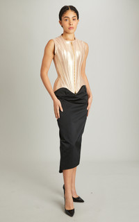 "Adam" zip-front corset in gold lamé with lace-up back PRODUCT DETAILS - As seen in the Fall/Winter '24 lookbook - Front zip, fitted - Unlined - Composition: 56% Cotton, 44% Polyamide - Color: gold - Zip fastening along front - Made in United States of America