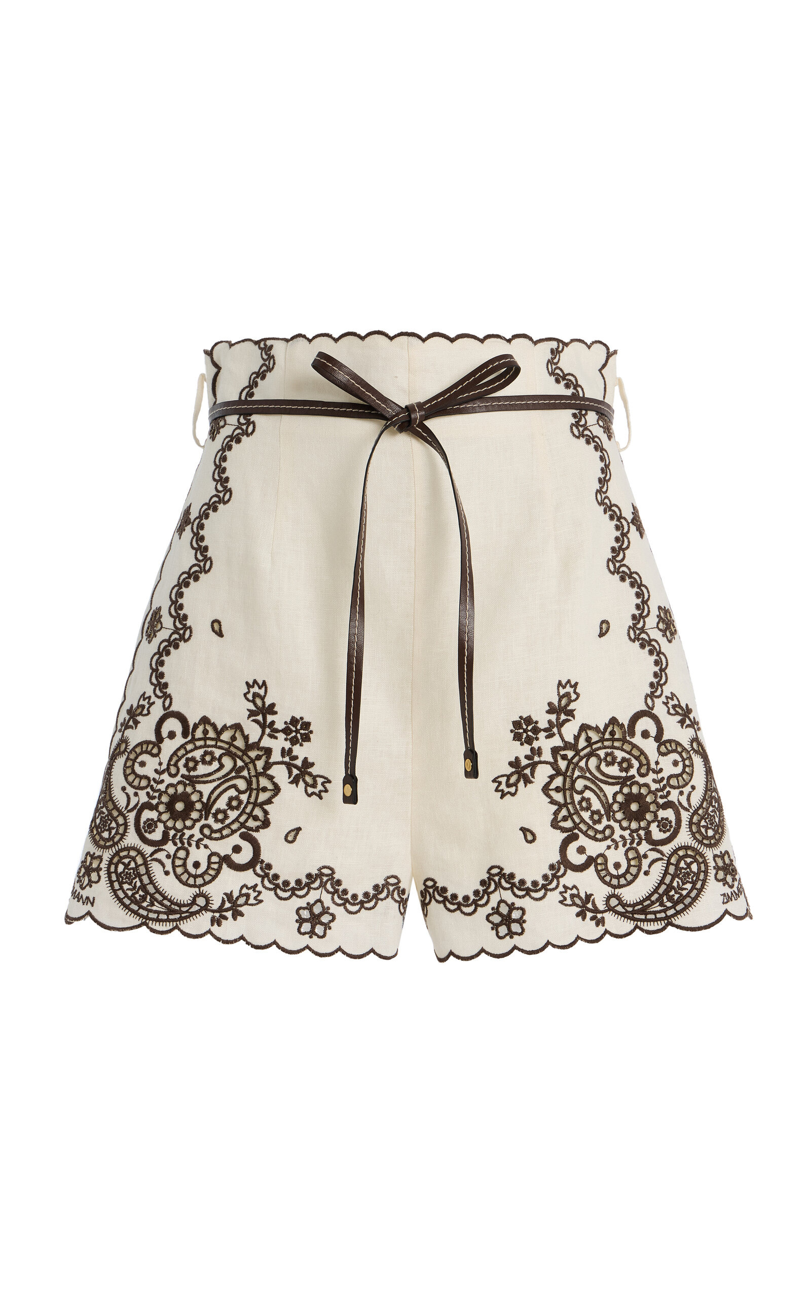 Sister Nicky and Simone Zimmermann, the design duo behind Zimmermann, have established themselves as stalwarts of the Australian design scene. Crafted from crisp, breathable linen, these high-waisted shorts are detailed with scalloped and paisley embroidery. PRODUCT DETAILS - Pre-Fall '25 - Concealed zip fastening along back - Composition: 100% Linen - Dry clean - Imported SIZE & FIT - Designed for a slim fit