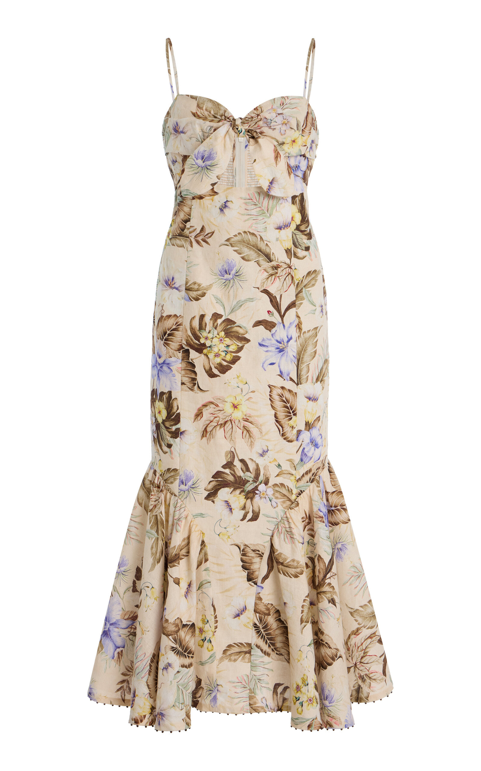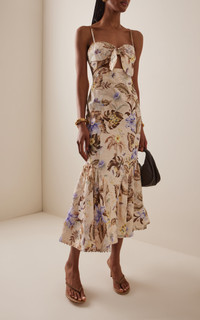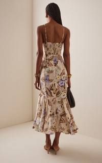 Sister Nicky and Simone Zimmermann, the design duo behind Zimmermann, have established themselves as stalwarts of the Australian design scene. Crafted from crisp, breathable linen, this midi dress is woven to a fit-to-flare silhouette, slim through the waist and hips while flared at the hem. PRODUCT DETAILS - Pre-Fall '25 - Concealed zip fastening along back - Composition: 100% Linen - Dry clean - Imported SIZE & FIT - Designed for a slim fit