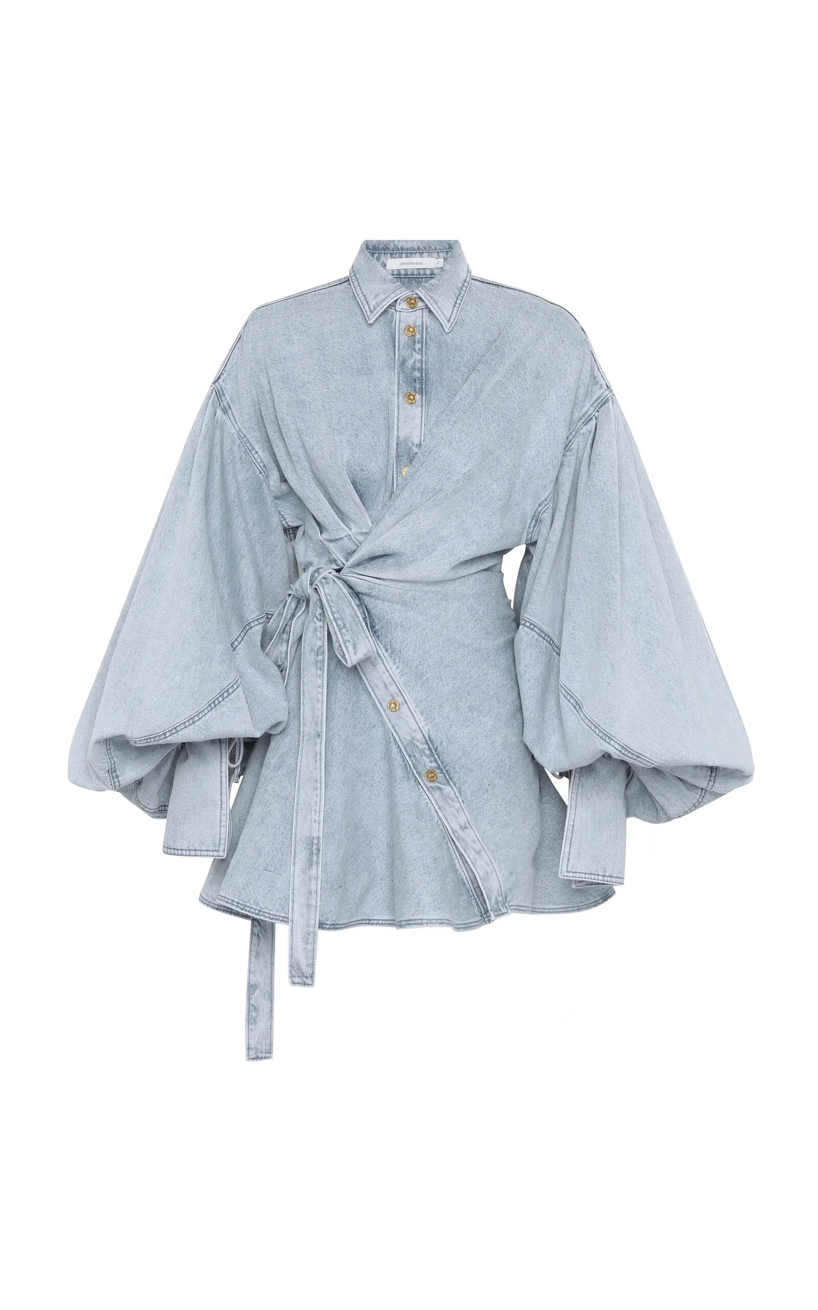 Regular fit, collar, balloon sleeves, mini hem, tie detailing at waist PRODUCT DETAILS - Regular fit, collar, balloon sleeves, mini hem, tie detailing at waist - Button fastenings through front - Composition: 100% Cotton - Color: light wash - Dry clean - Resort '26