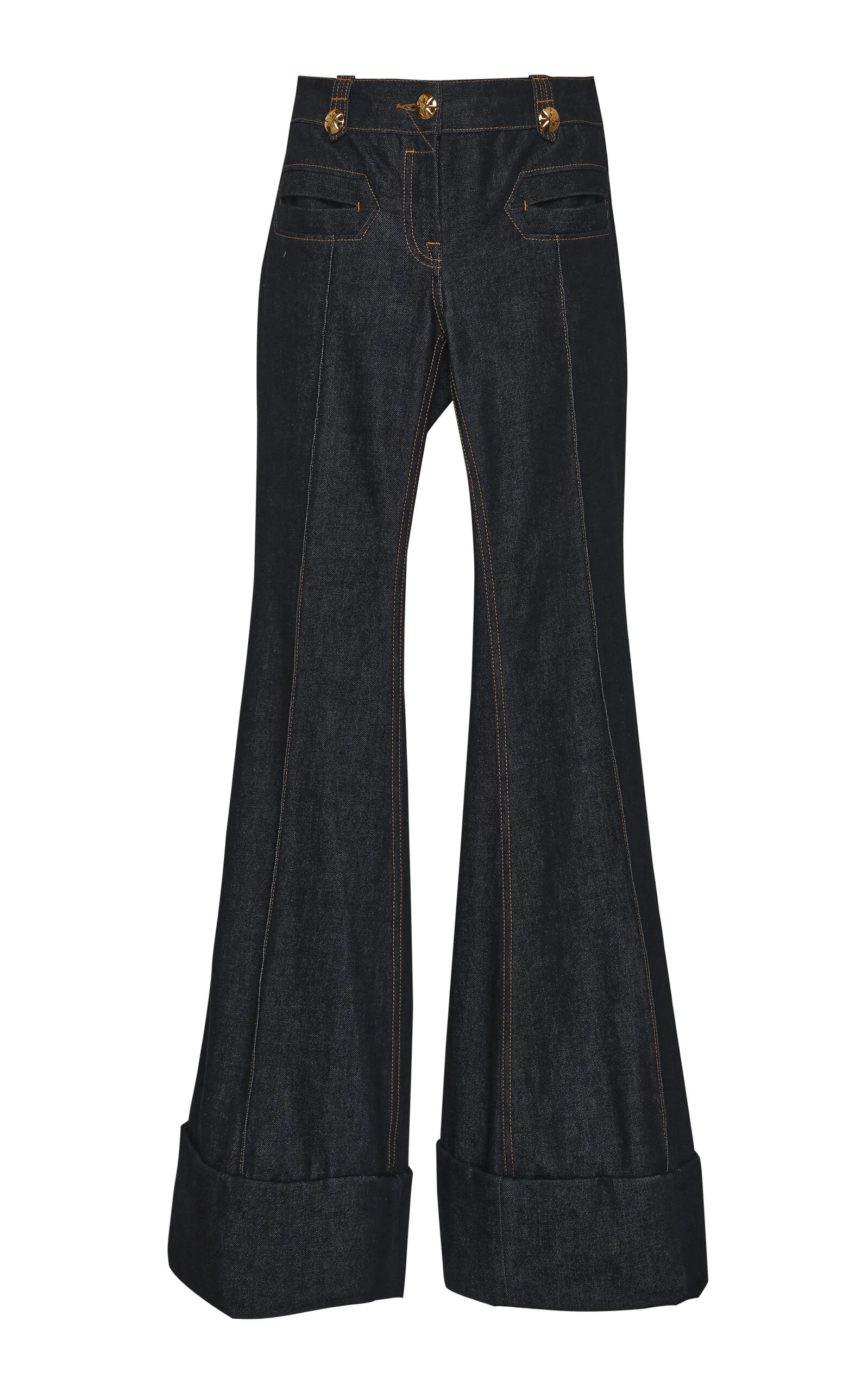 Regular fit, seam detail, belt loops, flare leg, cuffed hems PRODUCT DETAILS - Regular fit, seam detail, belt loops, flare leg, cuffed hems - Button and zip fastening - Composition: 75% Cotton 25% Viscose - Color: dark wash - Dry clean - Resort '26