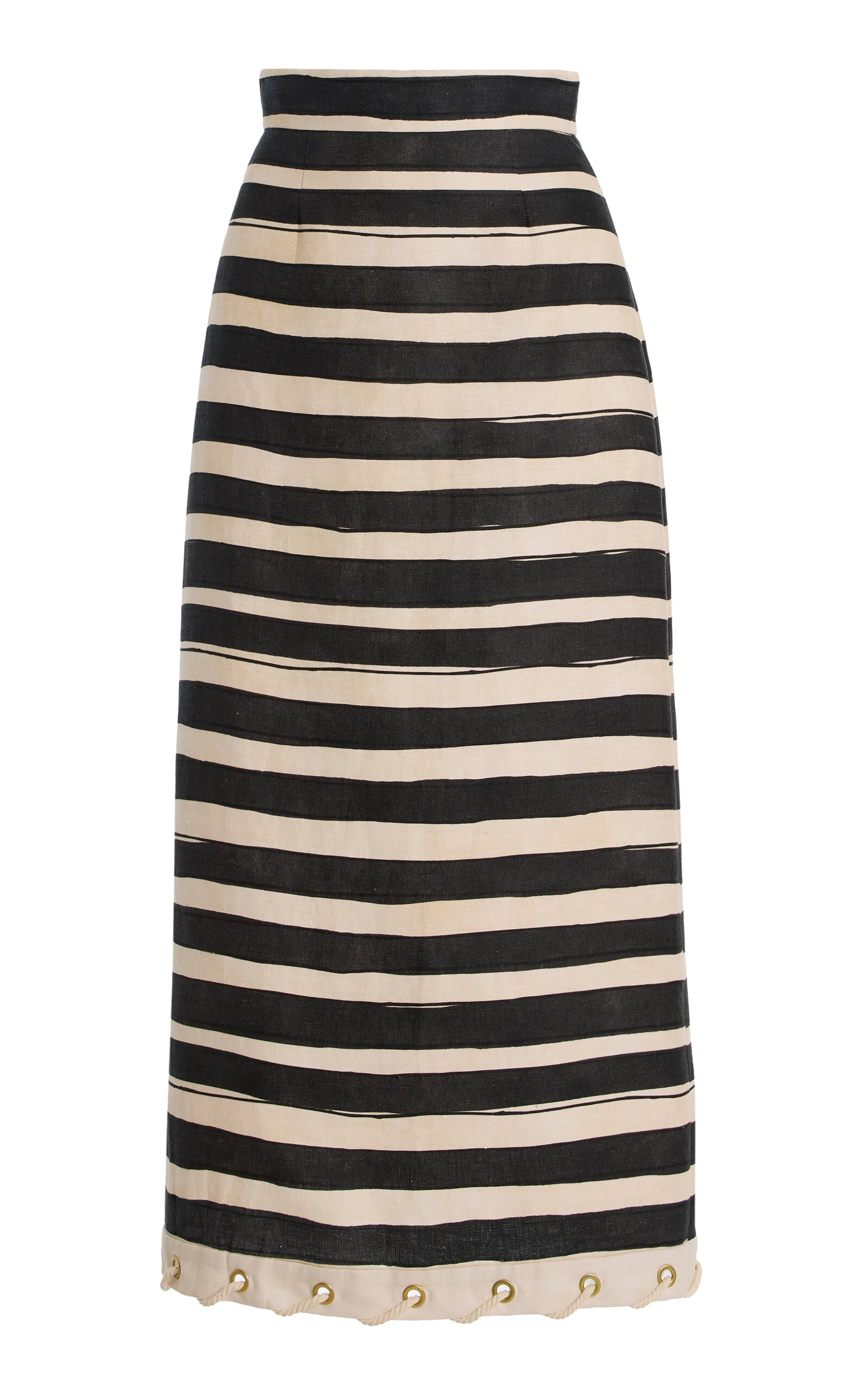 Sister Nicky and Simone Zimmermann, the design duo behind Zimmermann, have established themselves as stalwarts of the Australian design scene. The ‘Rebellion’ midi skirt is cut from 100% linen in a column silhouette, detailed with bold stripes and rope-inspired eyelets along the hem. Style it with the matching top for a coordinated look. PRODUCT DETAILS - Resort '26 - Concealed zip fasetning at back - Composition: 100% linen - Dry clean - Imported SIZE & FIT - Our model is wearing a size 1 - Model is 5'10” with a 30" bust, 24" waist, and 34" hip - Fits true to size, our fit specialist recommends taking your normal size - Designed to be fitted at the waist