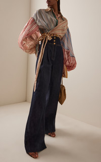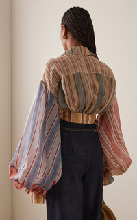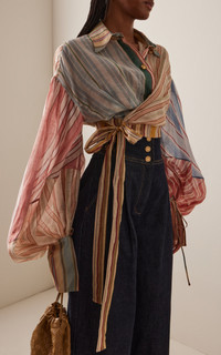 In Twisted Romance, Zimmermann embarks on a voyage through nostalgia, femininity, and the fantasy of escape — a Cruise 26 collection that reimagines pirate folklore through the soft-focus lens of modern romance. Cut from a patchwork of linen-silk, the 'Rebellion' shirt has a loose-fitting silhouette with balloon sleeves and a wrap-effect bodice that ties at the cropped hem. PRODUCT DETAILS - Resort '26 - Button fastenings through front - Composition: 55% linen, 45% silk - Dry clean - Imported SIZE & FIT - Our model is wearing a size 1 - Model is 5'10" with a 30" bust, 24" waist, and 34" hip - Fits true to size, our fit specialist recommends taking your normal size - Designed for a relaxed, cropped fit