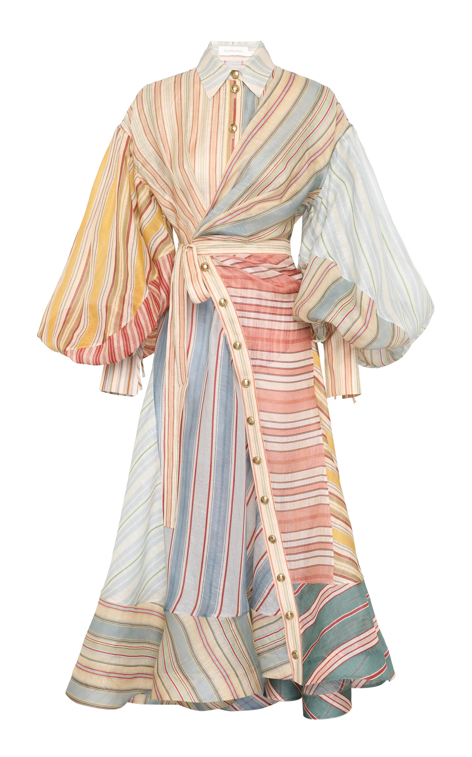 In Twisted Romance, Zimmermann embarks on a voyage through nostalgia, femininity, and the fantasy of escape — a Cruise 26 collection that reimagines pirate folklore through the soft-focus lens of modern romance. Cut from a patchwork of linen-silk, the 'Rebellion' shirt dress has a wrap silhouette with a loose-fitting bodice and balloon sleeves. PRODUCT DETAILS - Resort '26 - Button fastenings through front - Composition: 55% linen, 45% silk - Dry clean - Imported SIZE & FIT - Our model is wearing a size 1 - Model is 5'10" with a 30" bust, 24" waist, and 34" hip - Fits true to size, our fit specialist recommends taking your normal size - Adjustable fit through wrap-style bodice, relaxed through the skirt