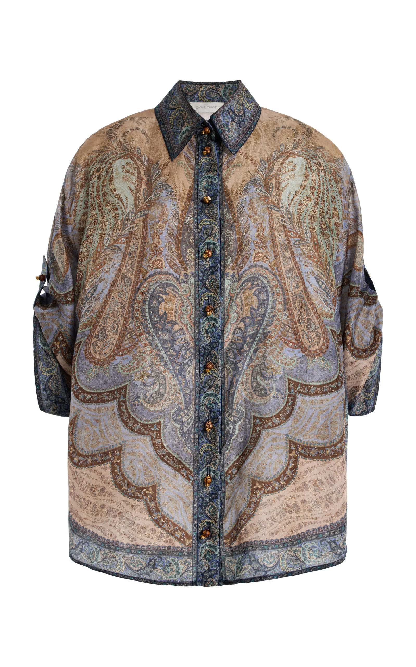 In Twisted Romance, Zimmermann embarks on a voyage through nostalgia, femininity, and the fantasy of escape — a Cruise 26 collection that reimagines pirate folklore through the soft-focus lens of modern romance. PRODUCT DETAILS - Resort '26 - Button fastenings through front - Composition: Main: 100% Silk - Dry clean - Imported SIZE & FIT - Our model is wearing a size 1 - Model is 5'10” with a 30" bust, 24" waist, and 34" hip