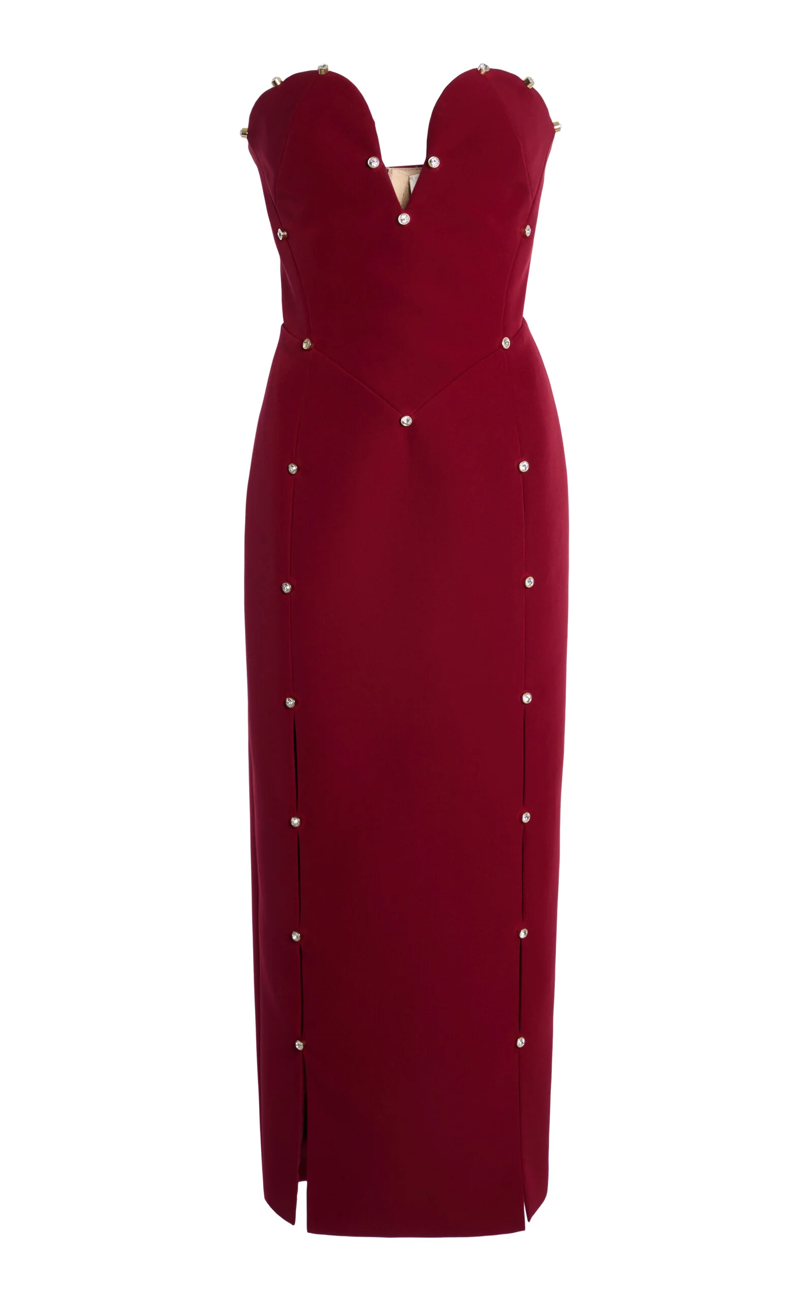 PRODUCT DETAILS - Slim fit, deep sweetheart neckline and strapless, embroidered detailing with cutouts and rivet throughout, column silhouette maxi - Zip Fastening Through Back - Lined - Composition: 90% Polyester 10% Elastane Others: 50% Glass Fibre 50% Zama Secondary: 100% Polyamide Lining: 94% Cupro 6% Elastane - Color: Cabernet - Dry Clean Only - Fall-Winter '25