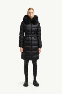 Protection and timeless elegance: the Boedic long down jacket fuses refined materials with attention to detail and a long-haired shearling trim. This Boedic long down jacket delivers a sophisticated winter look with a feminine silhouette defined by a belted waistline. The down coat's cozy hood is enriched with a luxurious long-haired shearling trim. The precious trim can be easily detached, depending on your mood or the weather conditions. DETAILS - Crafted from longue saison - Longue saison lining - Down-filled - Hood with detachable long-haired sheepskin trim - Zipper closure - Elastic belt with snap button closure - Zipped pockets with grosgrain details SIZE AND FIT - Regular fit - Fitted waist - Elasticized belt - Length (collar to hem): 95 cm COMPOSITION EXTERIOR: 100% Polyamide / Nylon; LINING: 100% Polyamide / Nylon; HOOD LINING: 100% Polyamide / Nylon; PADDING: 90% Down, 10% Feather;Leather with hair 1: SHEEP; Origin: China; Dyed Product code K20931C00015595FE999 Made in Armenia