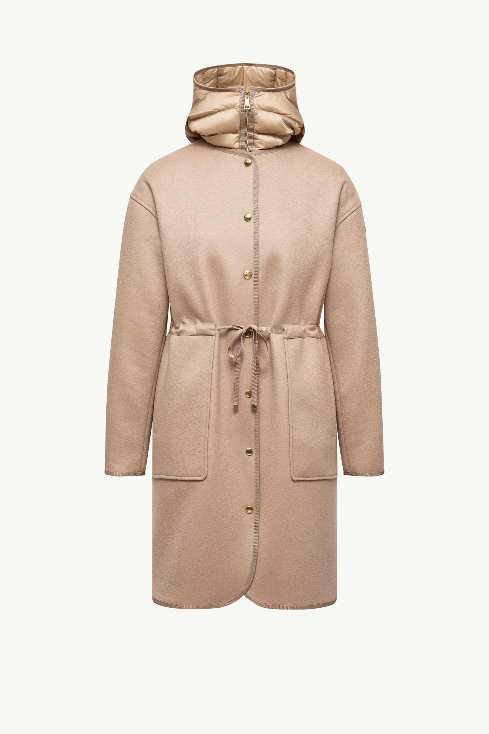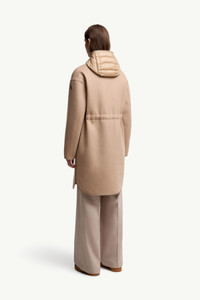 Easily worn in three different ways, the women's Bonreposse wool and cashmere coat is enhanced with a detachable inner down jacket. A versatile 3-in-1 design, the Bonreposse wool and cashmere coat is equipped with a detachable puffer on the inside. The inner down jacket is made from water-repellent nylon, allowing the warmer to easily adapt to different weather conditions. Ideal for any season, each piece can be styled separately or layered together. DETAILS - Crafted from a wool and cashmere blend - Longue saison lining - Detachable down-filled inner - Hood - Zipper and snap button closure - Zipped pockets - Detachable grosgrain belt - Leather logo patch COMPOSITION PART A: BASE FABRIC: 90% Virgin wool, 10% Cashmere;LEATHER TAG: CALF; PART B: EXTERIOR: 100% Polyamide / Nylon; LINING: 100% Polyamide / Nylon; HOOD LINING: 100% Polyamide / Nylon; PADDING: 90% Down, 10% Feather;LEATHER TAG: CALF Product code K20931C000175980N21T Made in Romania