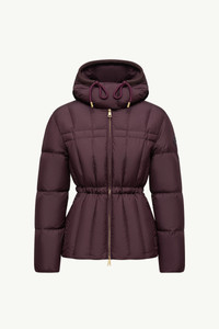 Playing with texture and movement, the Estom short down jacket for women creates soft pleats through bold quilting. Infusing the classic down jacket with new energy, the Estom explores fresh shapes and textures. Boasting a light weight and elevated matte finish, the puffer focuses on softness through a tactile brushed finish. The short warmer is completed by a flared silhouette, emphasizing the waistline while adding movement. DETAILS - Crafted from polyester - Polyester lining - Down-filled - Adjustable hood with knit trim - Zipper closure - Zipped pockets - Waist and hem with drawstring fastening - Leather logo patch SIZE AND FIT - The model is wearing a size 0 and is 180 cm tall - Regular fit - Cropped - Elasticized hemline - Length (collar to hem): 65 cm COMPOSITION EXTERIOR: 100% Polyester; Collar rib: 100% Virgin wool; LINING: 100% Polyester; HOOD LINING: 100% Polyester; PADDING: 90% Down, 10% Feather;LEATHER TAG: CALF Product code K20931A00172597YW458 Made in Romania