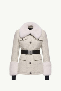 An elegant expression of classic winter leisurewear, the Moncler Grenoble Devez short down jacket for women features elegant shearling accents. Capturing altitude as an attitude, the Devez short down jacket reinterprets sartorial codes and fabrics for the mountain top. Presented in a field jacket shape, the short puffer is crafted from textured wool, while a shearling collar and cuffs adds a precious touch. A belted waistline completes the design, creating a feminine hourglass silhouette. Creating a textured total look, the design pairs easily with matching bottoms. DETAILS - Crafted from wool boutonne - Polyester lining - Down-filled and padded - Long-haired sheepskin adjustable collar and cuffs - Zipper and snap button closure - Pockets with snap button closure - Inside media pocket with YKK® AcquaGuard® highly water resistant zipper closure - Detachable leather belt - Stretch jersey wrist gaiters SIZE AND FIT - The model is wearing a size 1 and is 178 cm tall - Regular fit - Belted - Length (collar to hem): 69 cm COMPOSITION BASE FABRIC: 100% Virgin wool; LINING: 100% Polyester; PADDING: 90% Down, 10% Feather; DETAILS PADDING: 100% Polyester; 1 MATERIAL: 83% Polyamide / Nylon, 17% Elastane / Spandex;Leather with hair 1: LAMB; Origin: Spain; Dyed; LEATHER EXTERIOR: CALF Product code K209G1B00002598XRF09 Made in Romania