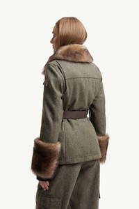 An elegant expression of classic winter leisurewear, the Moncler Grenoble Devez short down jacket for women features elegant shearling accents. Capturing altitude as an attitude, the Devez short down jacket reinterprets sartorial codes and fabrics for the mountain top. Presented in a field jacket shape, the short jacket is crafted from wool gabardine, while a shearling collar and cuffs add a precious touch. A belted waistline completes the design, creating a feminine hourglass silhouette. DETAILS - Crafted from wool gabardine - Recycled polyester lining - Down-filled and padded - Long-haired lambskin collar and cuffs - Adjustable collar - Zipper and snap button closure - Pockets with snap button closure - Inside media pocket with YKK® AcquaGuard® highly water resistant zipper closure - Detachable leather belt - Powder skirt - Stretch jersey wrist gaiters SIZE AND FIT - The model is wearing a size 1 and is 178 cm tall - Regular fit - Belted - Length (collar to hem): 69 cm COMPOSITION BASE FABRIC: 100% Virgin wool; LINING: 100% Polyester; PADDING: 90% Down, 10% Feather; DETAILS PADDING: 100% Polyester; 1 MATERIAL: 83% Polyamide / Nylon, 17% Elastane / Spandex;Leather with hair 1: LAMB; Origin: France; Dyed; LEATHER EXTERIOR: CALF Product code K209G1B0000259914889 Made in Romania