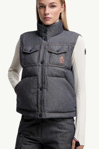 Bringing innovative fabrics to the fore, the Moncler Grenoble Knysna down vest for women reimagines classic denim with a technical twist. Reinventing a cult fabric, the Knysna down-filled vest is a contemporary take on casual winter outerwear. The puffer is crafted from an innovative type of denim, made technical through an advanced two-layer construction. Helping keep the elements at bay, the warmer is completed by water-resistant pockets. DETAILS - Crafted from 2L technical denim - Rainwear lining - Ultrasuede®nu collar and trim - Down-filled - Snap button closure - Pockets with YKK® AquaGuard® Highly Water Resistant zipper closure - Inner media pocket with YKK® AquaGuard® Highly Water Resistant zipper closure - Synthetic material logo patch SIZE AND FIT - The model is wearing a size 1 and is 178 cm tall - Regular fit - Length (collar to hem): 56 cm COMPOSITION BASE FABRIC: 100% Cotton; LINING: 100% Polyamide / Nylon; COLLAR: 100% Polyester; PADDING: 90% Down, 10% Feather; DETAILS PADDING: 100% Polyester Product code K20981A00007598RR989 Made in Romania