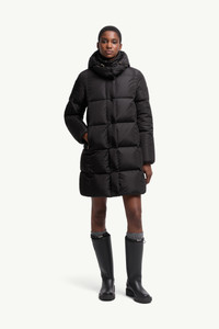 A sophisticated staple for when the temperature drops, the Litte long down jacket for women pairs geometric quilting with a satin finish. Protective fabrics and refined textures rise to the fore in the Litte down jacket. The long puffer is made from nylon technique, a water-repellent material with a silky smooth feel. Fusing technical performance with an elevated aesthetic, the warmer is an ideal companion for the city or the outdoors. DETAILS - Crafted from recycled nylon technique - Nylon laque lining - Down-filled - Detachable and adjustable hood - Zipper and snap button closure - Zipped pockets - Elastic cuffs COMPOSITION EXTERIOR: 100% Polyamide / Nylon; LINING: 100% Polyamide / Nylon; HOOD LINING: 100% Polyamide / Nylon; PADDING: 90% Down, 10% Feather Product code K20931C00020539ZD99B Made in Romania