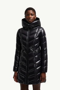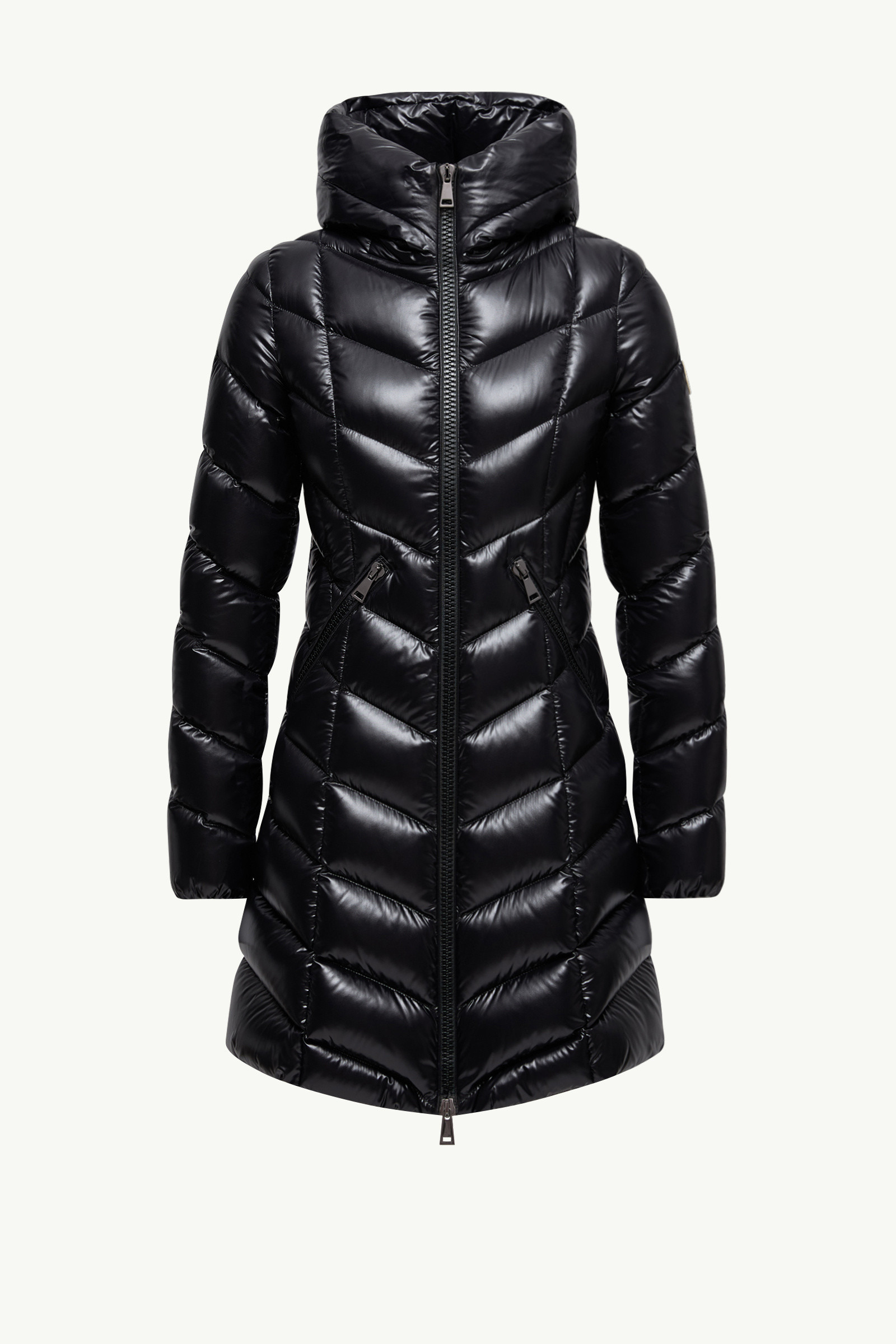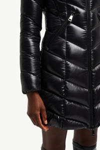 The Marus long down jacket for women boasts a flared silhouette and graphic quilting that enhances femininity. The Marus long down jacket is crafted from iconic nylon laque and is characterized by the chevron quilting that accentuates the silhouette. The down coat's hood, zipper pockets and the down quilting guarantee comfort and protection. DETAILS - Crafted from nylon laque - Nylon laque lining - Down-filled - Hood - Zipper closure - Zipped pockets - Elastic cuffs - Logo SIZE AND FIT - Slim fit - Length (collar to hem): 85 cm COMPOSITION EXTERIOR: 100% Polyamide / Nylon; LINING: 100% Polyamide / Nylon; HOOD LINING: 100% Polyamide / Nylon; PADDING: 90% Down, 10% Feather Product code K20931C00038C0065999 Made in Armenia