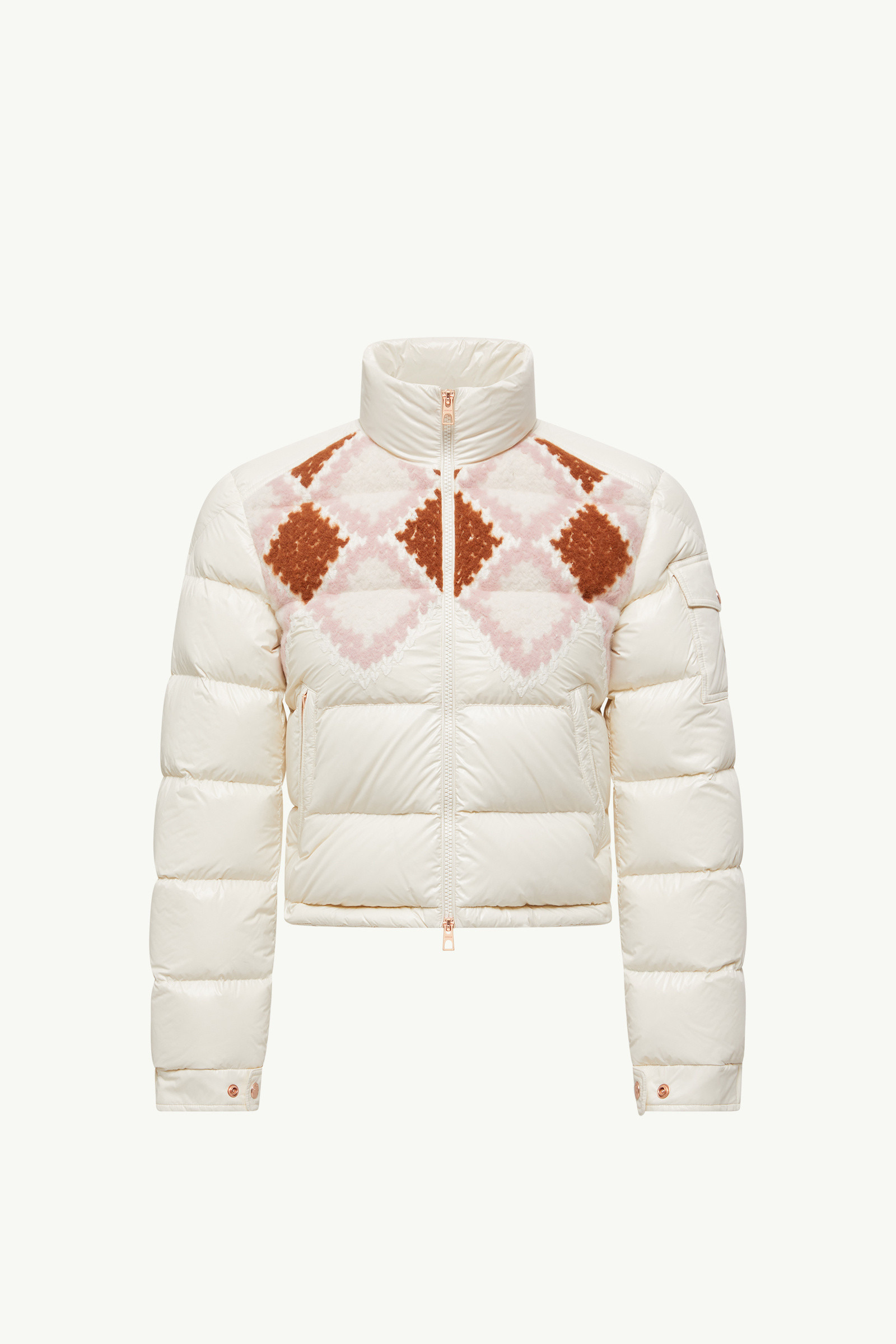 Playing with texture, the Megara short down jacket for women combines light-catching nylon with knit accents. Influenced by classic knitwear, the Megara down jacket is enriched with an embroidered rhombus pattern. The short puffer pairs the soft wool blend accents with glossy nylon, creating contrast. Adding a feminine touch to any look, the warmer comes in a pastel color palette. DETAILS - Crafted from nylon - Super laque lining - Down-filled - Zipper closure - Zipped pockets - Sleeve pocket with snap button closure - Elastic cuffs - Hem with drawstring fastening - Embroidered wool blend rhombus pattern - Jacquard logo detail SIZE AND FIT - The model is wearing a size 0 and is 175 cm tall - Regular fit - Length (collar to hem): 50 cm COMPOSITION OUTER BODY : 100% Polyamide / Nylon; LINING: 100% Polyamide / Nylon; PADDING: 90% Down, 10% Feather; 1 MATERIAL: 100% Polyamide / Nylon; Embroidery: 45% Acrylic, 44% Wool, 11% Polyester Product code K20931A00108598T5F25 Made in Italy