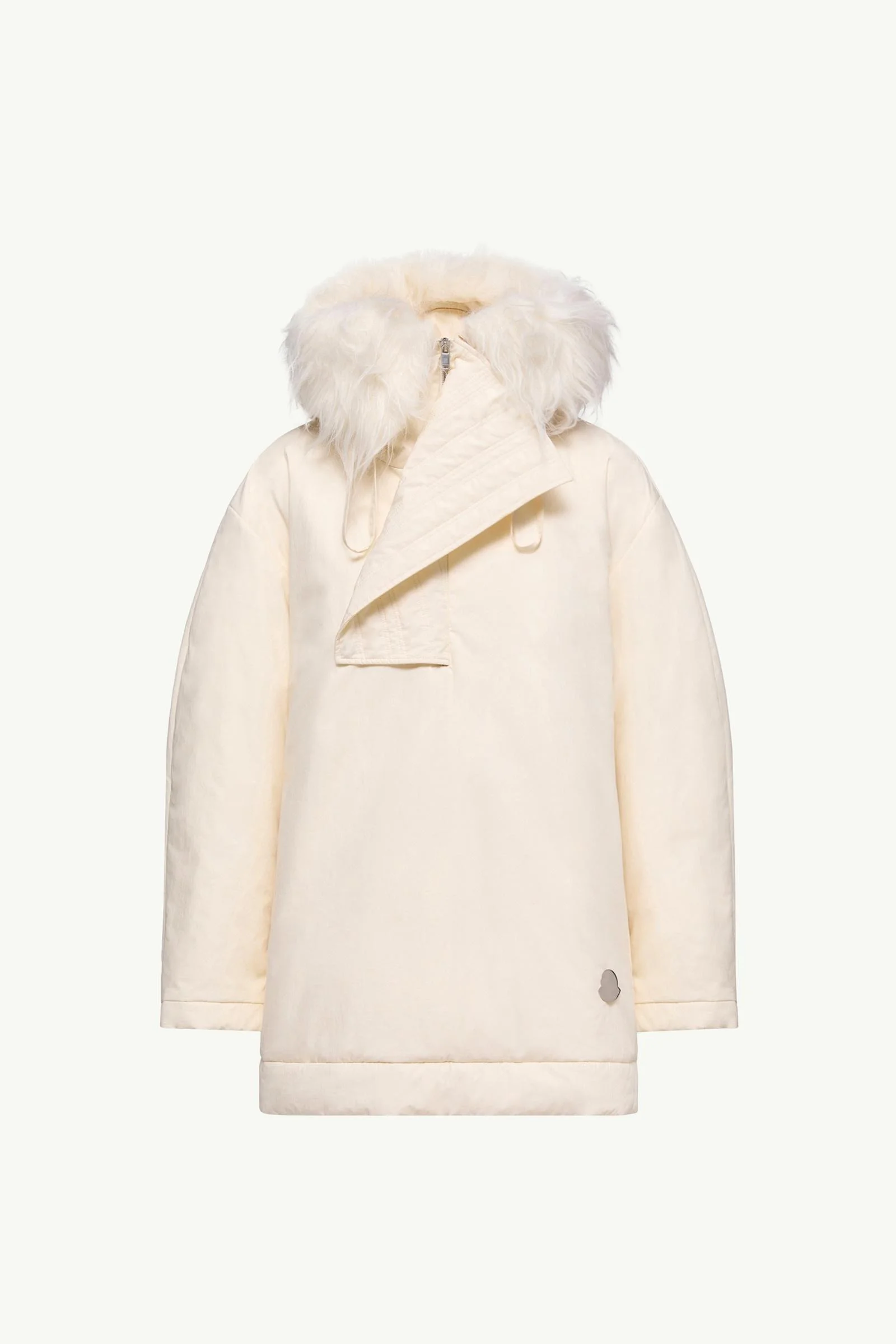 An interplay of natural fabrics, the Moncler + JIL SANDER Bowtiediene short down jacket for men and women pairs cotton with a tactile trim. Encapsulating the Moncler + JIL SANDER collection's vision, natural textures are reinterpreted in the Bowtiediene short down jacket. Made from lightweight cotton, the puffer is detailed with a detachable wool blend trim at the hood, lending softness and contrast to the piece. A tailored collar conceals the zipper to preserve a sleek silhouette, while a metal logo from the co-creation adds a subtle accent. DETAILS - Crafted from cotton - Cotton lining - Down-filled - Hood with detachable wool blend trim - Collar - Half-zipper closure - Adjustable cuffs and hem - Detachable metal logo pin SIZE AND FIT - The female model is wearing a size 0 and is 176 cm tall - The male model is wearing a size 3 and is 186 cm tall - Oversized fit - Length (collar to hem): 87 cm COMPOSITION EXTERIOR: 100% Cotton; LINING: 100% Cotton; HOOD LINING: 100% Cotton; PADDING: 90% Down, 10% Feather; DETAILS PADDING: 100% Polyester;LEATHER INSERTS: LAMB Product code K24051A00014M6390050 Made in Italy