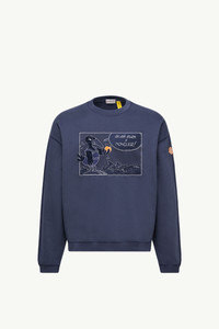 A laidback design for men, this Moncler x Gilga Farm by Donald Glover sweatshirt is characterized by an embroidered cartoon-style motif. A versatile layer, this Moncler Genius sweatshirt shows the brand's mascot visiting Donald Glover's Gilga farm. The playful Moncler x Gilga Farm by Donald Glover crew neck is crafted from soft cotton fleece. DETAILS - Crafted from cotton fleece - Ribbed crew neck - Embroidered logo motif - Logo patch SIZE AND FIT - The model is wearing a size M and is 185 cm tall - Loose fit COMPOSITION BASE FABRIC: 100% Cotton; Ribs: 95% Cotton, 5% Elastane / Spandex; Embroidery: 100% Polyester Product code K24028G0000289AUJ786 Made in Turkey