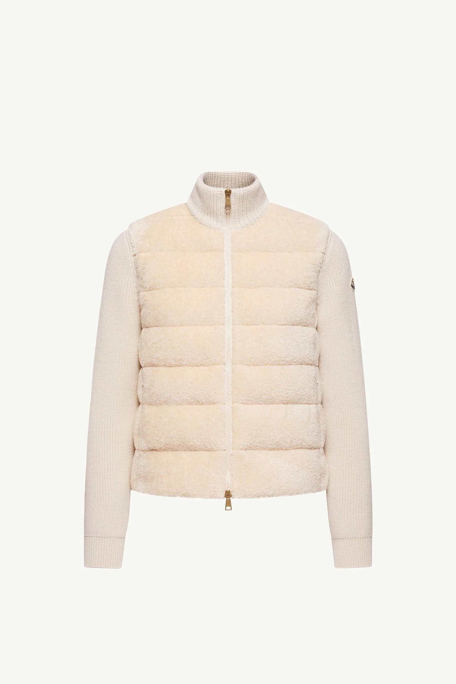 Taking knitwear to new textural heights, this padded zip-up cardigan for women is defined by contrasting finishes. Texture becomes a quiet statement as teddy fleece and ultra-fine Merino wool converge in this cardigan. Defined by a down-filled construction, the mid-weight knit is completed with a high neck for ultimate comfort. DETAILS - Crafted from ultra-fine Merino wool - Teddy fleece front and back - Longue saison lining - Down-filled - High neck - Ribbed knit - Gauge 7 and 5 - Zipper closure - Zipped pockets SIZE AND FIT - The model is wearing a size XS and is 174 cm tall COMPOSITION BASE FABRIC: 60% Acrylic, 40% Cotton; BODY LINING: 100% Polyamide / Nylon; COLLAR: 100% Virgin wool; PADDING: 90% Down, 10% Feather; SLEEVES: 100% Virgin wool Product code L10939B00033M1131050 Made in Moldova