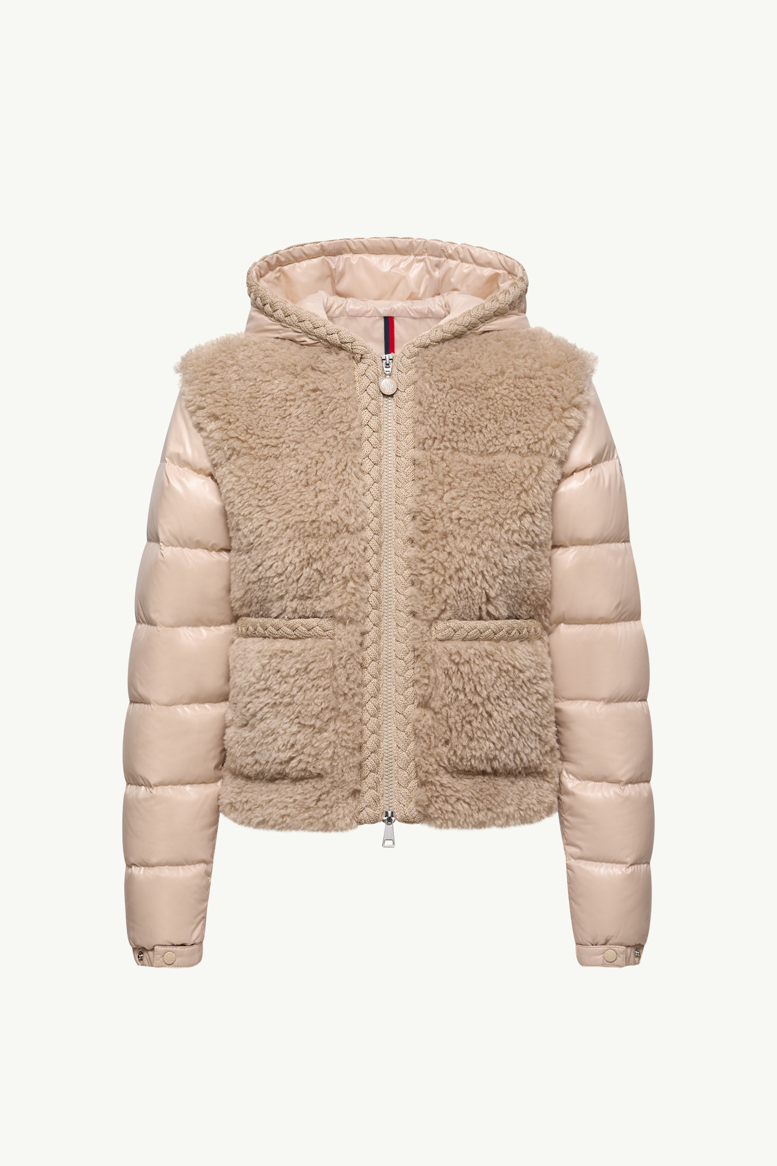 Characterized by a plush feel and tactile finish, the Plantay short down jacket for women is crafted from teddy. Exploring different textures, the Plantay short down jacket pairs the softest teddy with nylon laque. The emblematic fabric is noted for its luxurious glossy finish and water-repellent protection. Adding a feminine touch, the puffer's cropped shape is accentuated by a braided trim. DETAILS - Crafted from teddy - Nylon laque lining, sleeves and hood - Braided trim - Down-filled - Adjustable hood - Zipper closure - Patch pockets - Adjustable cuffs - Hem with drawstring fastening SIZE AND FIT - The model is wearing a size 0 and is 181 cm tall - Regular fit - Length (collar to hem): 53 cm COMPOSITION EXTERIOR: 100% Polyamide / Nylon; OUTER BODY : 100% Polyester; LINING: 100% Polyamide / Nylon; HOOD LINING: 100% Polyamide / Nylon; PADDING: 90% Down, 10% Feather; BODY PADDING: 100% Polyester Product code K20931A0001189B0G268 Made in Hungary