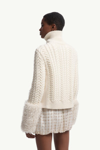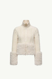 Exploring new ways of expressing texture, this women's zip-up cardigan pairs a cable knit finish with a plush tactile trim. A sophisticated interpretation of a cold weather essential, this zip-up cardigan is accentuated by soft faux fur accents. The design is knit from a wool blend, enhanced by a cable knit finish. DETAILS - Crafted from a wool and nylon blend - Polyester sides - Faux fur cuffs - Cable knit - Gauge 3 - Zipper closure - Snap button closure at the side - Logo patch SIZE AND FIT - The model is wearing a size XS and is 180 cm tall - Loose fit COMPOSITION BASE FABRIC: 92% Wool, 8% Polyamide / Nylon; LINING 1: 70% Polyester, 30% Cotton; LINING 2: 100% Polyamide / Nylon; FRONT LINING: 100% Polyamide / Nylon; DETAILS PADDING: 100% Polyester; 1 MATERIAL: 100% Polyester; 2 MATERIAL: 70% Polyester, 30% Cotton Product code K20939B00050M2346034 Made in Moldova