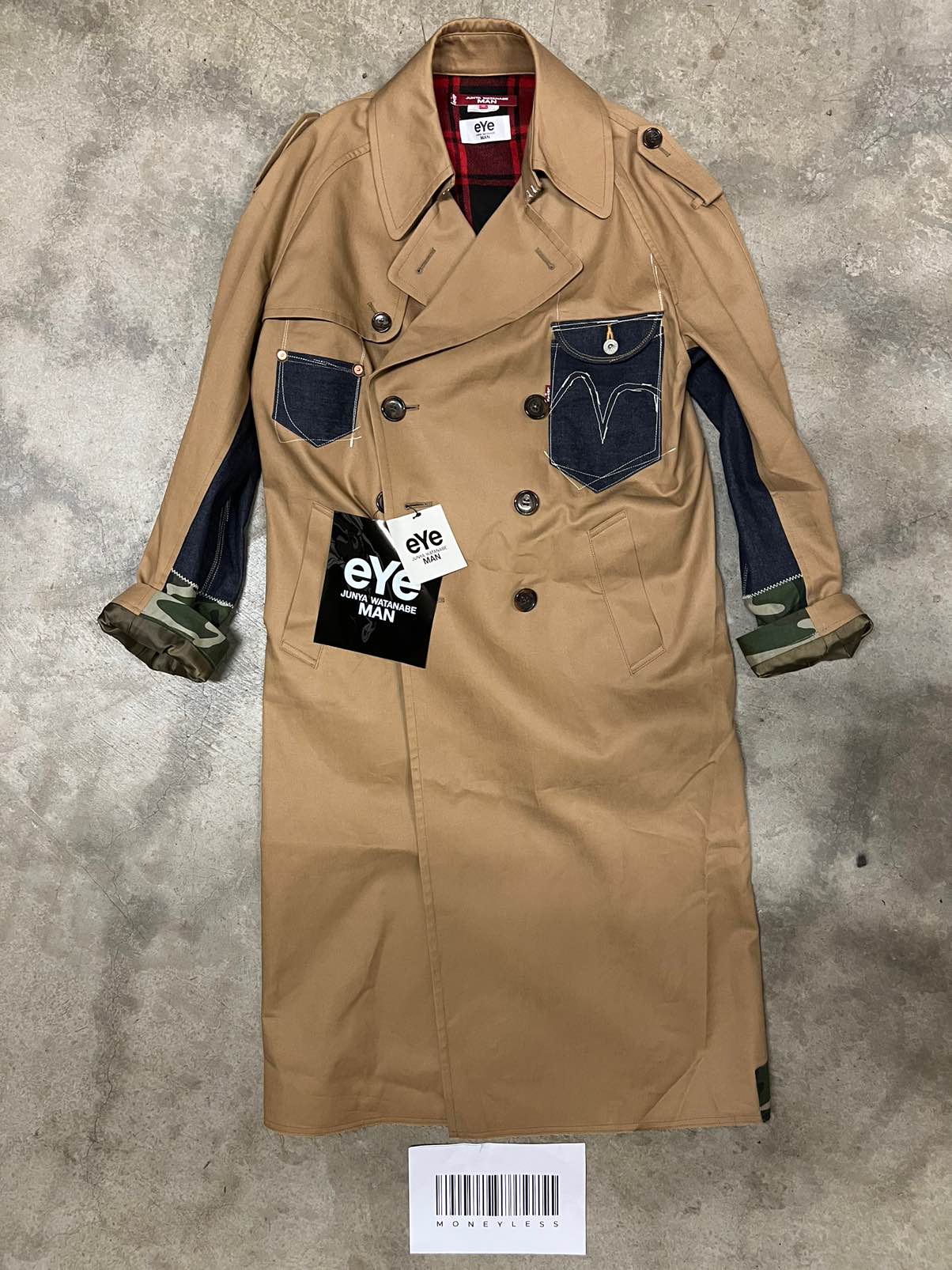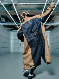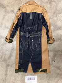 contrasting patchwork-denim trench coat