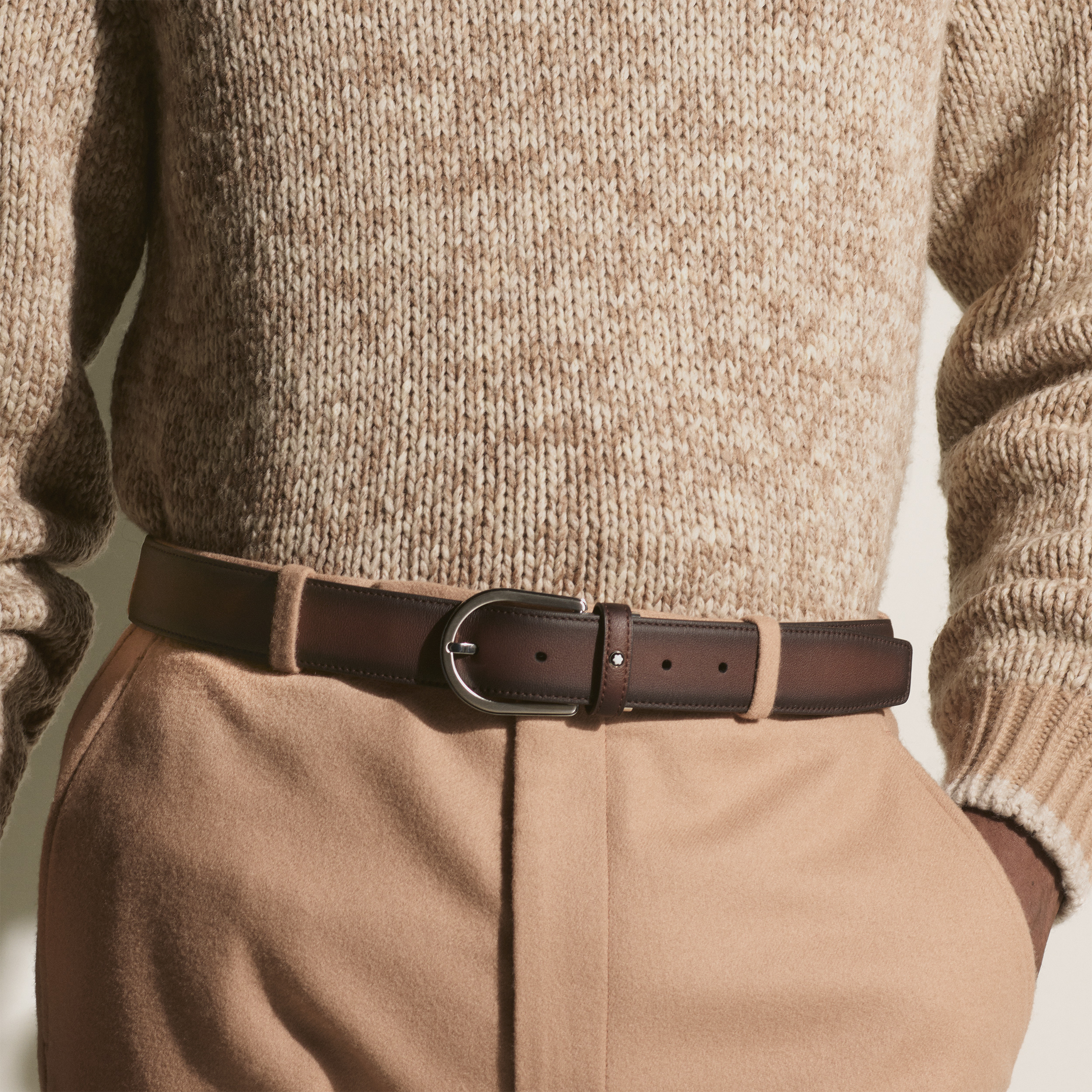 Horseshoe shiny & matte stainless steel pin buckle. Self-adjustable, 3.5 cm x 120 cm, brown plain leather strap featuring the unique patina of hand-painted leather with a delicate gradation of colors. Ident No. MB118413 Material MATERIAL Calf-skin leather FINISH Shiny and Matte BUCKLE MECHANISM Easy-to-open mechanism to adjust strap length SHAPE Horseshoe EMBLEM LOCATION Montblanc emblem on leather loop COLOR Brown Dimensions DIMENSIONS 47.24 × 1.38 × 0.20 inches FITTINGS / EMBLEM Emblems are manually centered, one by one, by our artisans. The emblem is centrally positioned, but the manual pressure operation with the machine may shift the emblem itself. This is a characteristic that does not compromise the aesthetic of the product and could not be accepted as complaint according to our policy.