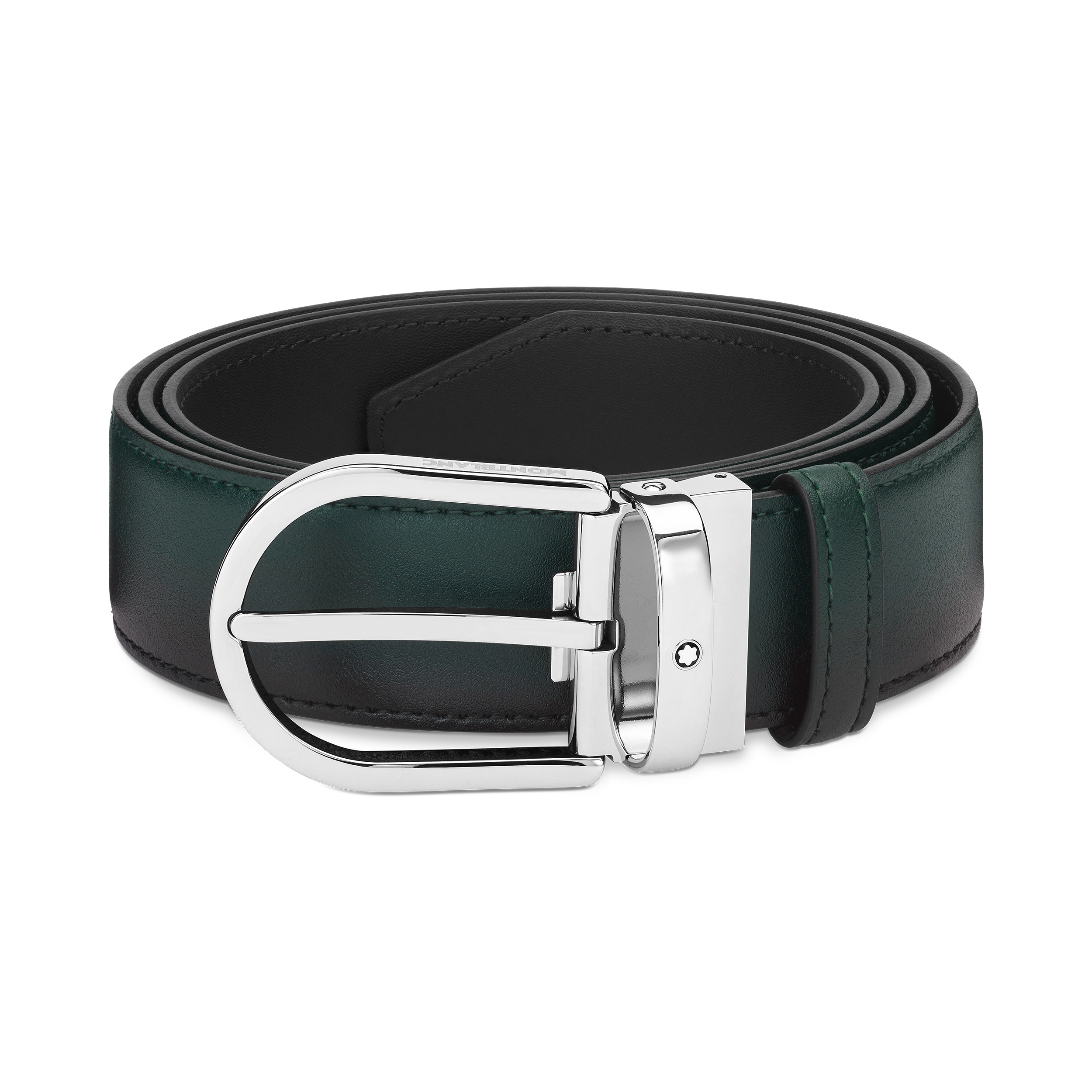 Crafted from the finest smooth leather, this 35mm belt is finished with a timeless palladium horseshoe buckle. Refined sfumato British green pays homage to the original colors of our icon – the Montblanc Meisterstuck. Ident No. MB198644 Material MATERIAL Cowhide COLOR British Green Dimensions DIMENSIONS 47.24 × 1.38 × 0.20 inches