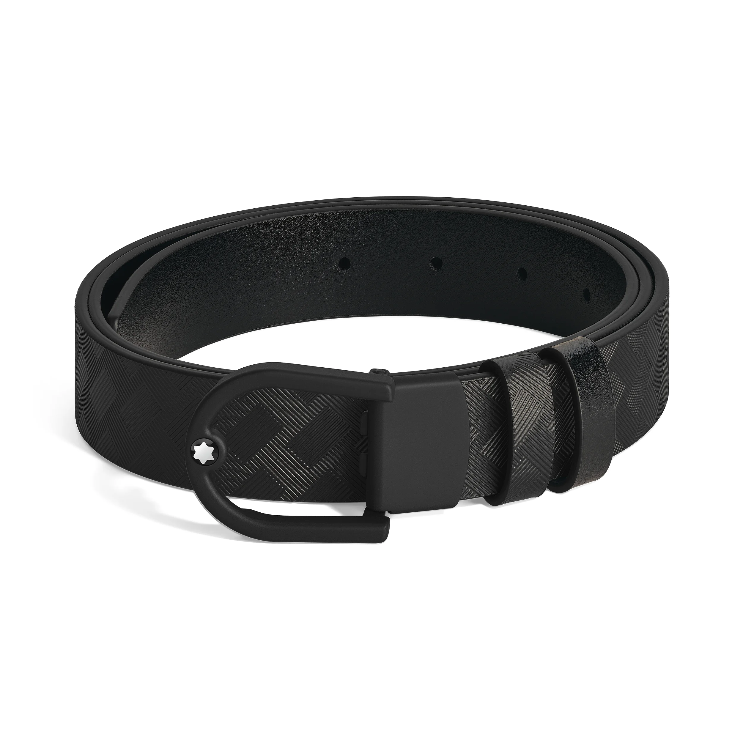 This reversible 30mm belt combines the sleek silhouette of a rubberized PVD-finished buckle with the versatility of two distinct leather straps. With clean and curved lines, the horseshoe buckle adds a touch of modern sophistication to your style. The belt strap offers versatility and refined style, featuring two distinct looks in one accessory: while one side showcases black Extreme 3.0 printed leather with a bold, textured design, the reverse features sleek black Meisterstuck leather for a timeless, polished finish. Ident No. MB222397