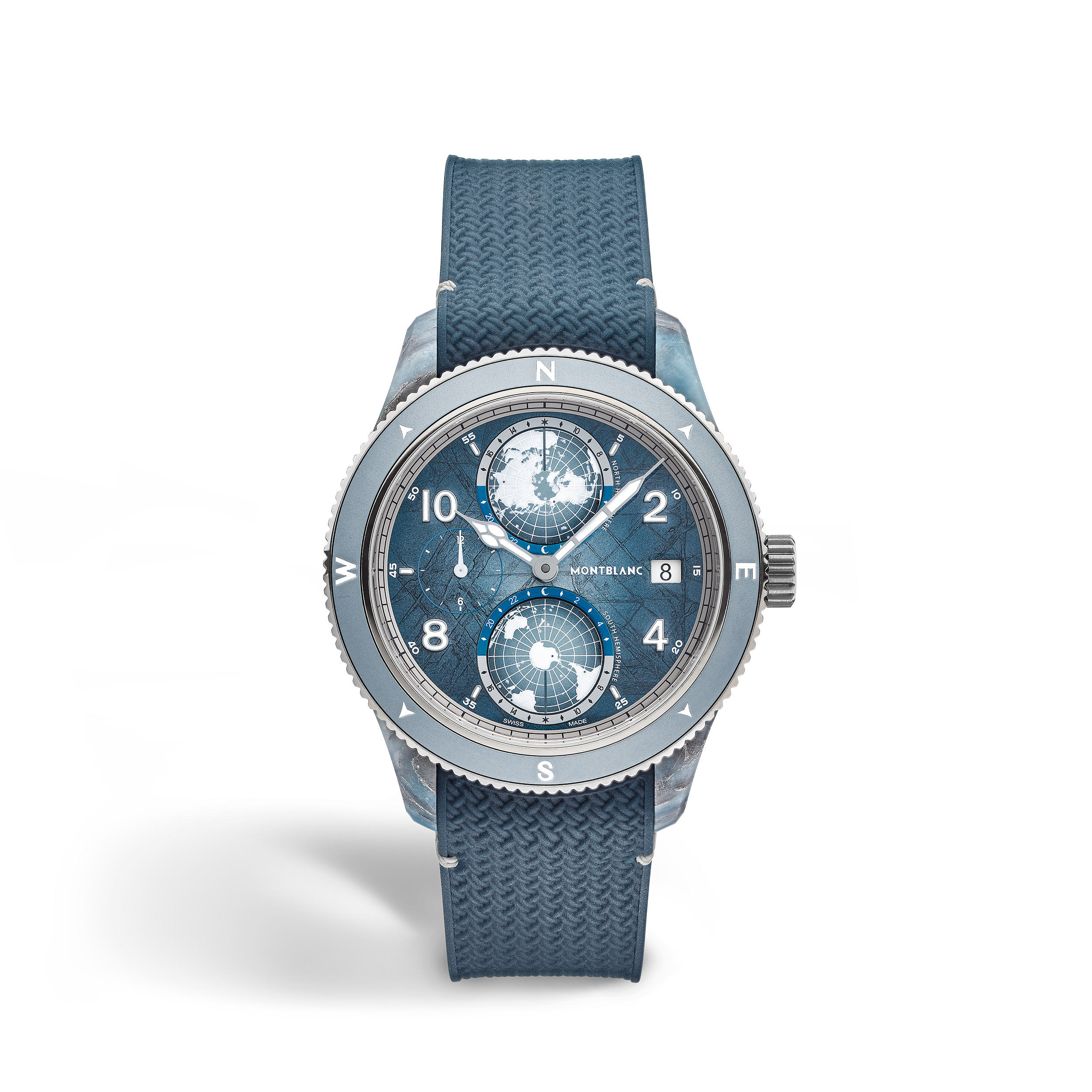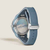 Montblanc’s 1858 Geosphere 0 Oxygen collection continues to explore the planet’s wildest landscapes with a series dedicated to alpinist and Montblanc Mark Maker Reinhold Messner and his achievement of climbing the seven highest mountain peaks on each of the seven continents. This first edition refers to the seventh peak – Mount Vinson. This Geosphere 0 Oxygen edition is limited to 986 pieces (as a nod to 1986 – the year when Messner made his ascent of Mount Vinson). It comes in a 43.5 mm titanium case that is directly inspired by the Mount Vinson landscape with a composite middle case crafted from quartz fibres, aluminized basalt fibres, CaCO₃, and light blue resin. Reinforcing the theme of adventure, the case totally devoid of oxygen comes with an engraved luminous gray outline of the Mount Vinson on the side while a 3D colored laser engraving of this majestic peak adorns the titanium case back. The timepiece is powered by the MB 29.25 automatic movement with Montblanc’s Manufacture worldtime complication, which includes rotating Northern and Southern Hemisphere globes, a 24-hour scale, Day & Night indications, dual time display, and a date. Completing the timepiece is a blue-green interchangeable rubber strap featuring a taper and a fine adjustment system. Ident No. MB134019 Movement MOVEMENT TYPE Automatic movementManufacture worldtime complication FREQUENCY (VPH) 4 /h NUMBER OF JEWELS 26 Jewels Case CASE DIAMETER 1.71 inches CASE HEIGHT 0.51 inches SAPPHIRE CRYSTAL Domed sapphire crystal with anti-reflective coating