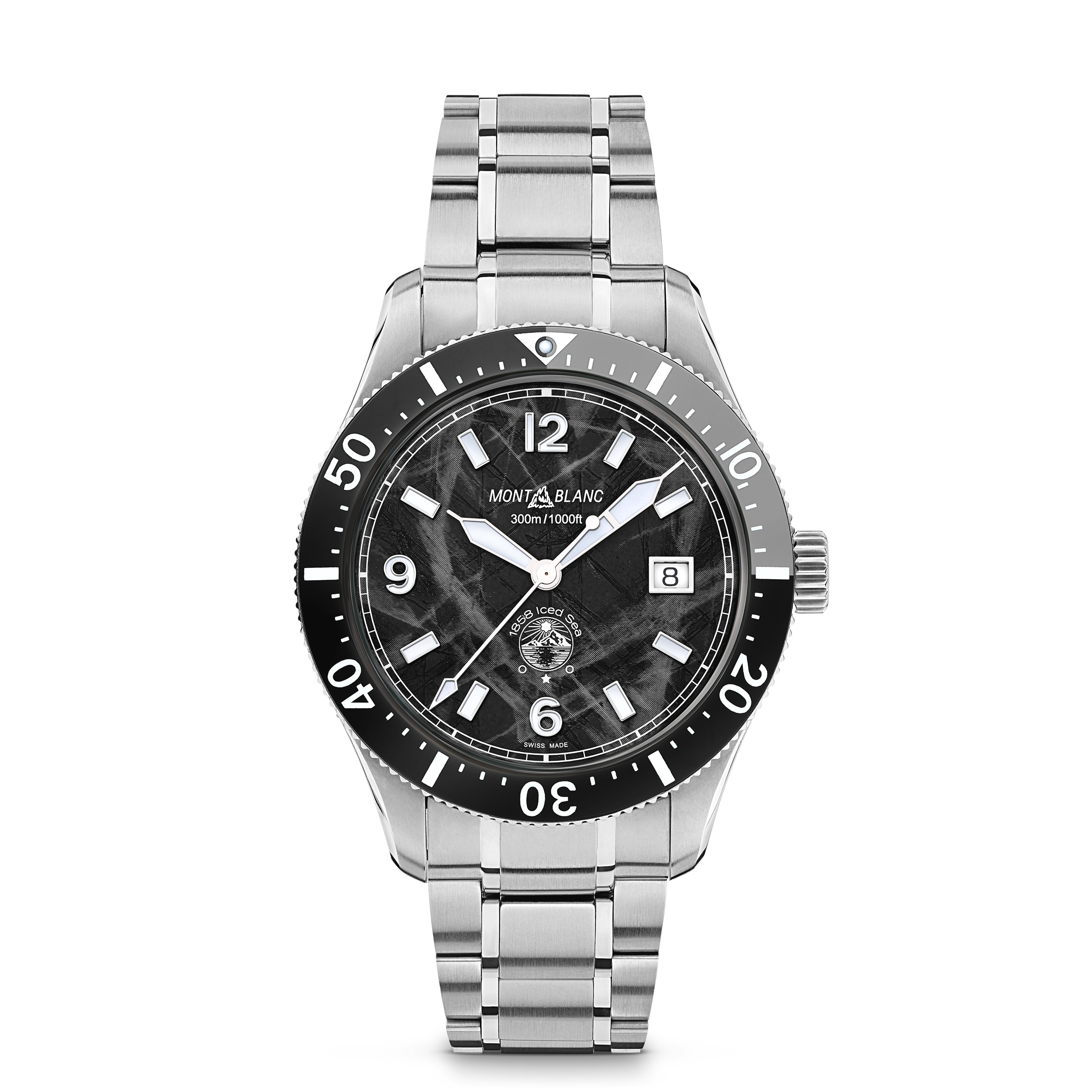 The first-ever sports diving watch for Montblanc, the Montblanc 1858 Iced Sea Automatic Date features a glacier pattern dial that gives the impression of looking into the depths of a glacier. This black glacial pattern dial is inspired by the Mer de Glace - Sea of Ice - the main glacier of the Mont-Blanc Massif. Its texture was achieved using an almost-forgotten ancestral technique called gratté-boisé. The timepiece comes with a unidirectional bicolor ceramic bezel, an engraved case back, and a tapered interchangeable stainless steel bracelet with fine adjustment for precision fitting. The timepiece conforms to the ISO 6425 norm for diving watches and is water-resistant to 300 meters. Ident No. MB129371 Movement MOVEMENT TYPE Automatic, self-winding MOVEMENT CALIBER MB 24.17 NUMBER OF JEWELS 26 Jewels FLAT HAIRSPRING Complications INDICATIONS Hours, Minutes, Calendar aperture, Second in center COMPLICATIONS Date by disc Case CASE MATERIAL Stainless Steel DIAL Black glacier dial with white luminescent Arabic numerals BEZEL Unidirectional rotating bezel CRYSTAL SHAPE Domed CRYSTAL DESCRIPTION Domed glass box with anti-reflective coating CRYSTAL TYPE Sapphire CROWN Screwed and fluted in stainless steel with Montblanc emblem in relief BEZEL COLOR Black WATER RESISTANT 30 bar (300 m) bar CASE BACK MATERIAL Stainless steel case with unidirectional bicolor ceramic bezel BRACELET COLOR Steel CASE DIAMETER 1.61 inches BEZEL MATERIAL Steel - Ceramic