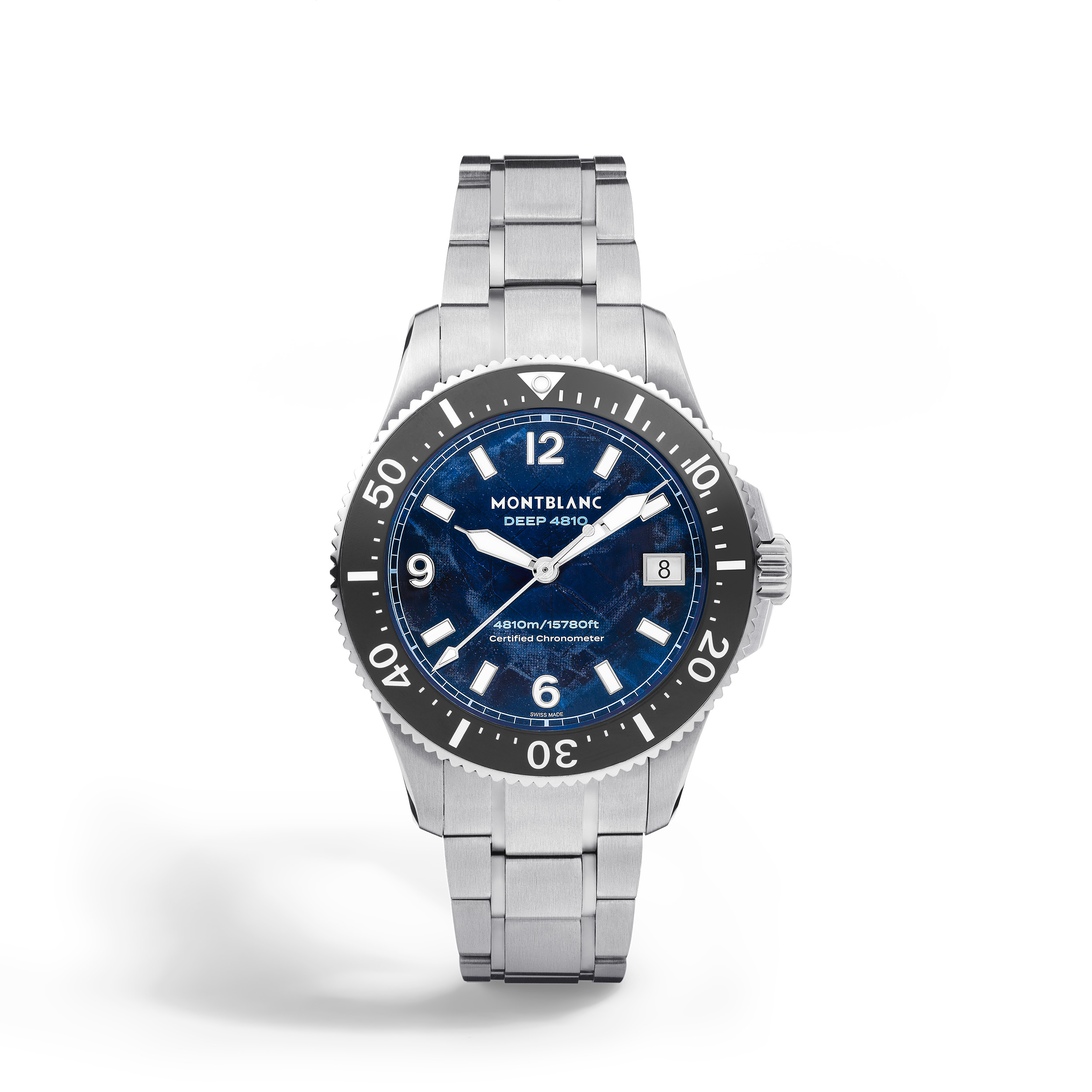 After having strived for the greatest heights, Montblanc explores the marine universe at 4810 meters below sea level with the Montblanc Iced Sea 0 Oxygen Deep 4810. The glacier pattern dial is inspired by the Mer de Glace - Sea of Ice - the main glacier of the Mont-Blanc Massif. Its texture was achieved using an almost-forgotten ancestral technique called gratte-boise. Housed in a 43 mm titanium case totally devoid of oxygen with a shield protecting the screw-down crown, this diving watch comes with a case back adorned with a 3D engraving of the view divers see when diving underneath the ice. The timepiece is powered by Montblanc’s Manufacture, COSC-certified, automatic MB 29.29 movement, with approx. five days of power reserve and conforms to the ISO 6425 norm for scuba diving. It is water-resistant to 4810 meters. Ident No. MB135634
