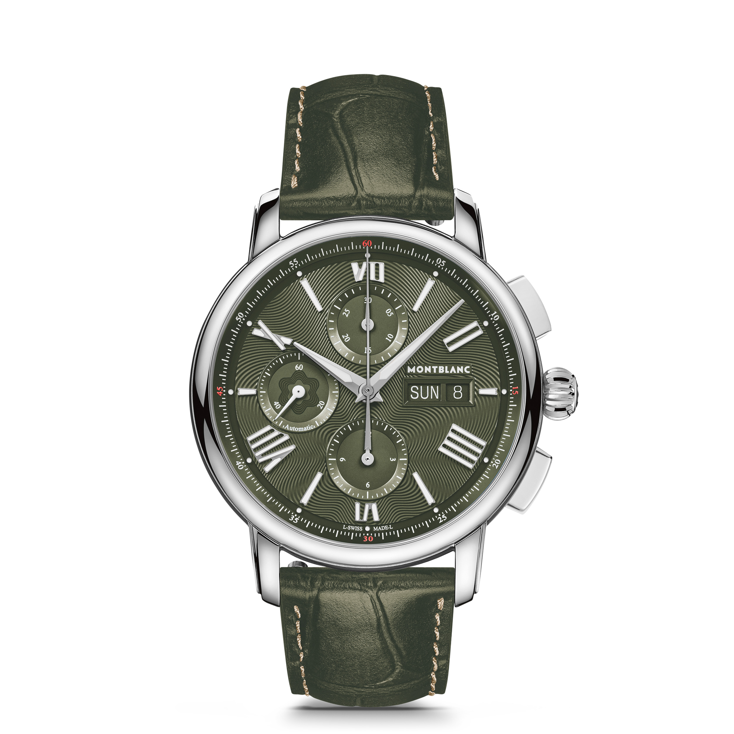 The Montblanc Star Legacy Chronograph Day & Date Limited Edition of 800 pieces takes its inspiration from Minerva pocket watches from the late 19th and early 20th century with their round, polished, pebble-shaped cases and onion-shaped crowns. Its beautiful green dial features Montblanc’s signature exploding star pattern along with rhodium-coated sword-shaped hands and numerals. It is powered by the automatic movement MB 25.07 that includes a chronograph, the day of the week, and the date. This timepiece is also fitted with an interchangeable green calf leather strap with alligator print and ecru stitching. Ident No. MB132950 Movement MOVEMENT TYPE Automatic movement Chronograph POWER RESERVE 48 h FREQUENCY (VPH) 4 /h FREQUENCE (HZ) 28800,0 Hz NUMBER OF JEWELS 25 Jewels Case CASE DIAMETER 1.69 inches CASE HEIGHT 0.58 inches WATER RESISTANT 5 bar (50 m) bar BEZEL MATERIAL Stainless Steel SAPPHIRE CRYSTAL Sapphire crystal case back